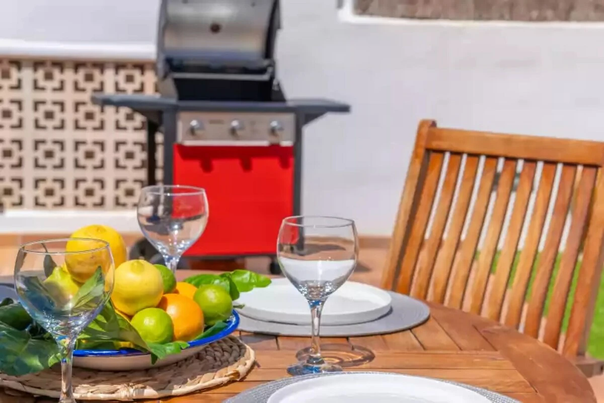 Das 200 m2 große Anwesen ist auf zwei Etagen verteilt. Im Erdgeschoss empfängt uns ein gemütliches und helles Wohnzimmer, wo Sie sich entspannen oder fernsehen können, während Sie sich mit der Klimaanlage abkühlen. Durch einen Torbogen gelangen wir in den Essbereich, traditionell und mit einer Kapazität für 6 Personen. Die Küche ist unabhängig und mit Induktionskochfeld ausgestattet und bietet alles, was man zum Kochen braucht. Auf dieser Etage finden Sie ein Duschbad mit Waschbecken und WC und ein weiteres Zimmer mit Dusche und Waschbecken. Die drei Schlafzimmer befinden sich im ersten Stock. Eines mit zwei Einzelbetten und die anderen beiden mit einem Doppelbett. Zwei Schlafzimmer haben einen Ventilator und das andere hat eine Klimaanlage. Ein zweites Badezimmer mit Dusche befindet sich auf dieser Etage. Wenn Sie mit einem Baby reisen, stehen Ihnen ein Kinderbett und ein Hochstuhl zur Verfügung. Es gibt auch eine Waschmaschine, ein Bügeleisen und ein Bügelbrett.