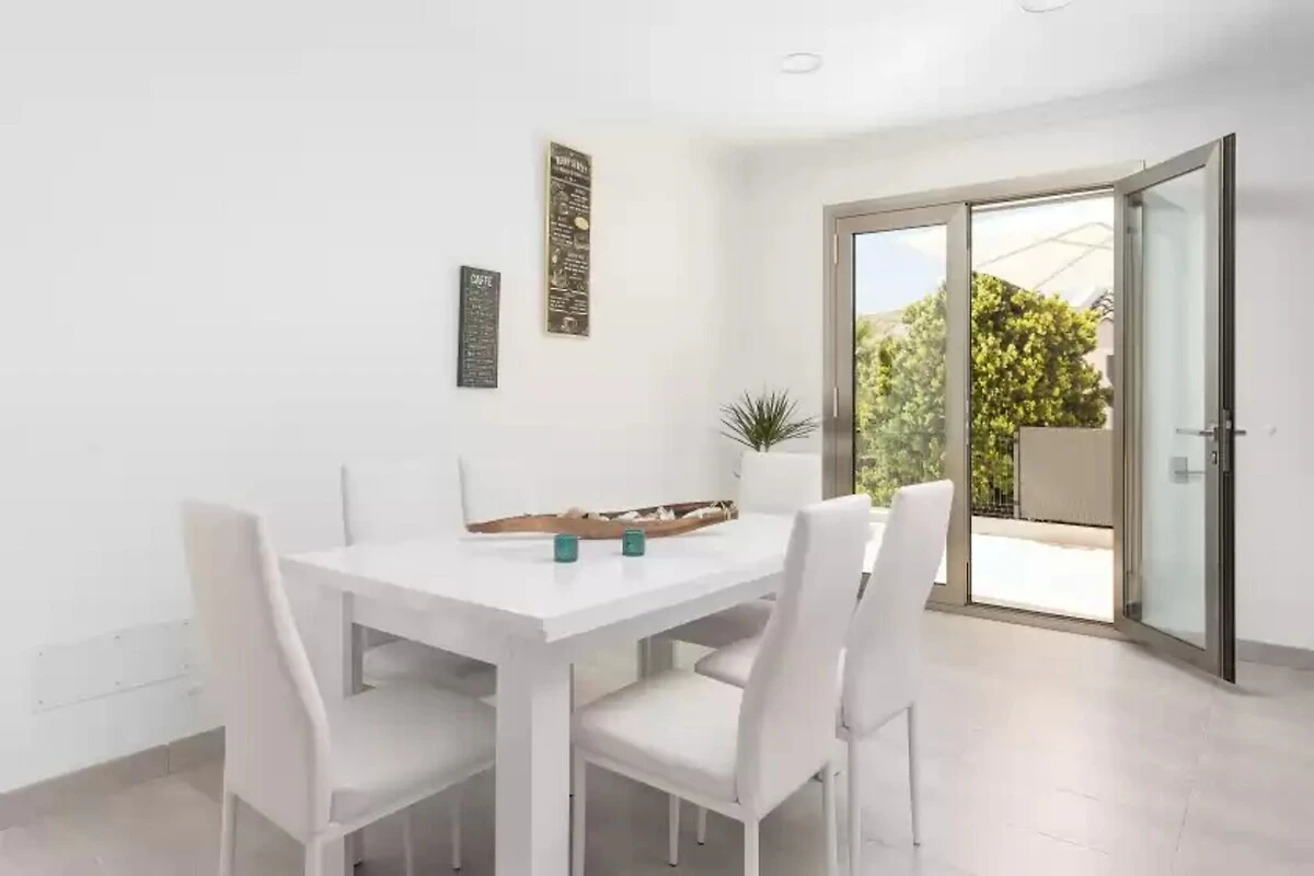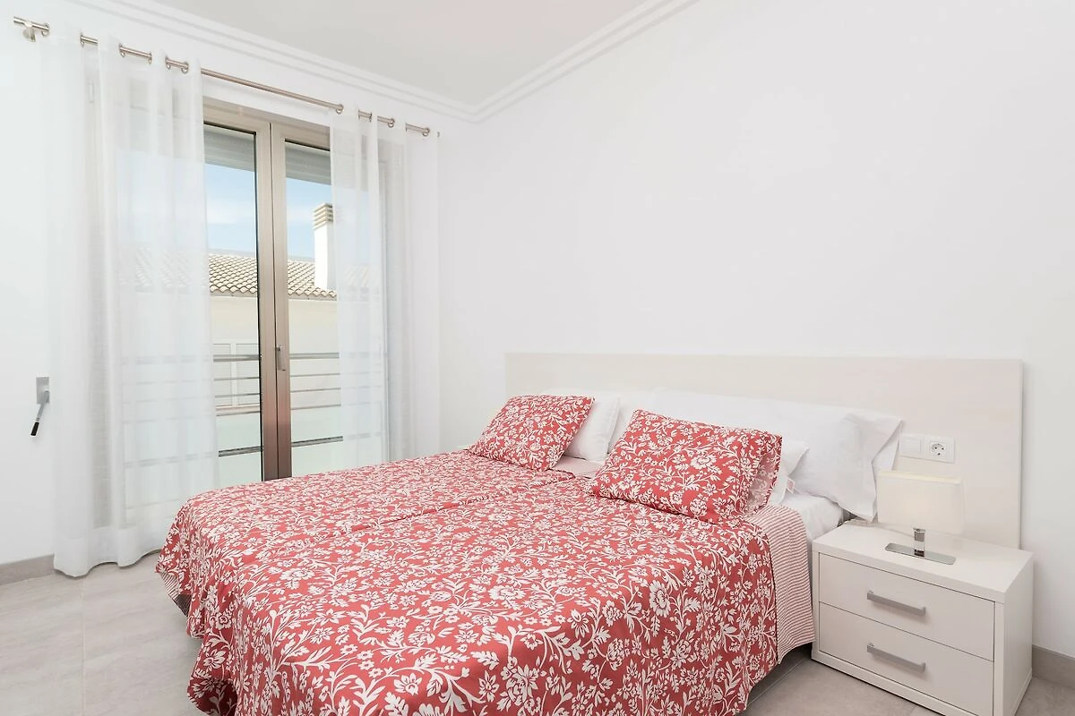 Das Ferienhaus wurde im Jahr 2017 fertiggestellt. Der Stil lässt sich als modern-mediterran beschreiben. Dafür sorgen die Fliesenböden, die hellen Möbel und hübsche Bilder, die hier und da für Farbakzente sorgen. Im geräumigen Wohn-Esszimmer kann man je nach Lust und Laune den Fernseher einschalten (TV-SAT), ein Buch lesen oder gemeinsam essen. Vom Essbereich aus gelangt man direkt auf die hintere Terrasse - besonders praktisch, wenn man draußen ein Barbecue vorbereitet, aber drinnen essen möchte. Die offene Küche bietet eine gute Grundausstattung, um auch im Urlaub einfache Gerichte zubereiten zu können. Dazu gehören ein Cerankochfeld, eine Mikrowelle und ein paar Kochutensilien. Alle drei hellen Schlafzimmer mit Kleiderschrank befinden sich auf der 1. Etage. Zwei davon sind mit je 2 Einzelbetten ausgestattet, während das dritte Zimmer mit einem Ehebett versehen ist. Eines der Einzelbettzimmer hat noch zusätzlich ein en-suite Duschbad. Es gibt zwei Hochstühle und zwei Hochstühle. Das Haus ist voll klimatisiert (nur kalte Luft).