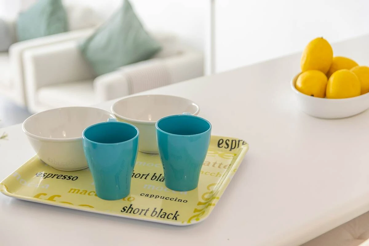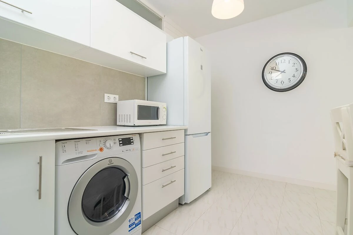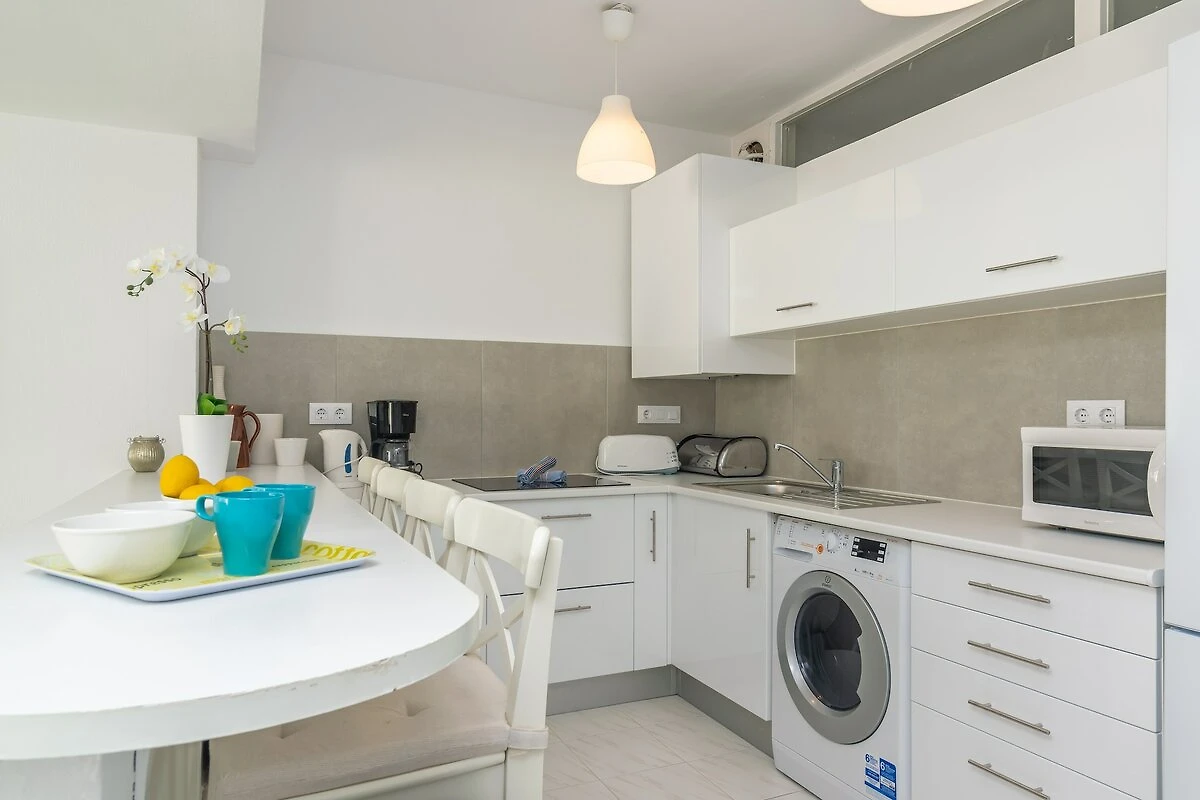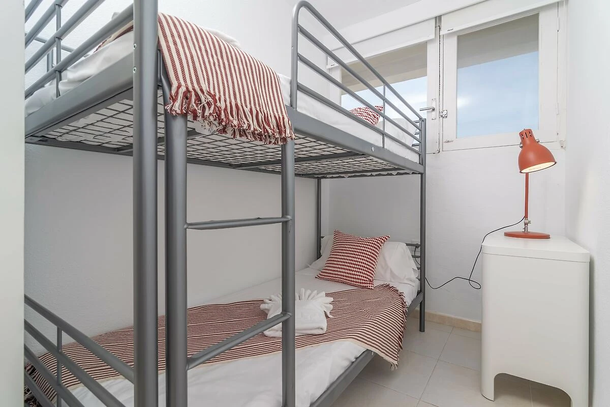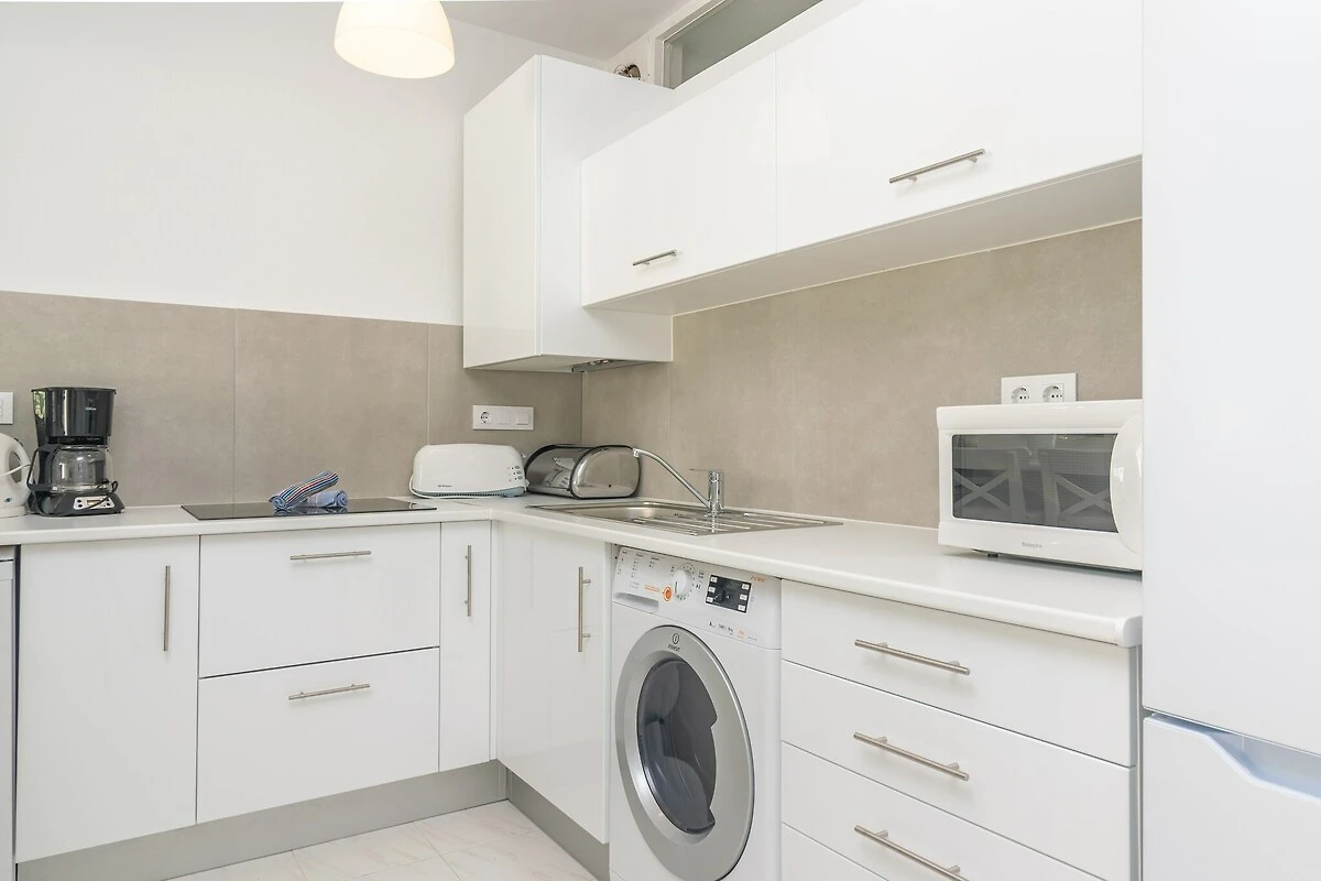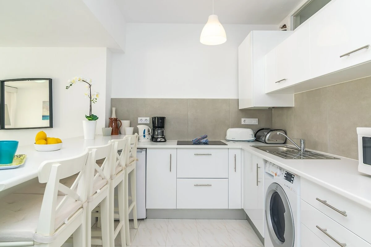 Das Apartment überzeugt mit einer hellen Einrichtung und klaren Linien. Wohn- Esszimmer mit Klimaanlage und Küche teilen sich einen Raum. Durch die große Terrassentür haben Sie von hieraus Blick auf das Meer und den Strand. Wenn Sie den Tisch einmal nicht auf der Terrasse decken möchten, eignet sich der Küchentresen perfekt für die Mahlzeiten. In der Küche kochen Sie auf einem Cerankochfeld und verfügen über alle wichtigen Geräte und Utensilien. Die verdiente ruhe finden sie in einem der insgesamt zwei Schlafzimmer mit Klimaanlage, eines mit einem Doppelbett und das andere mit einem Etagenbett. Alle Bewohner teilen sich ein Bad mit Badewanne. Es gibt eine Waschmaschine, Bügeleisen und Bügelbrett. Auf Anfrage stellen wir Ihnen ein Kinderbett und einen Hochstuhl zur Verfügung, wenn Sie mit Ihrem Baby reisen.