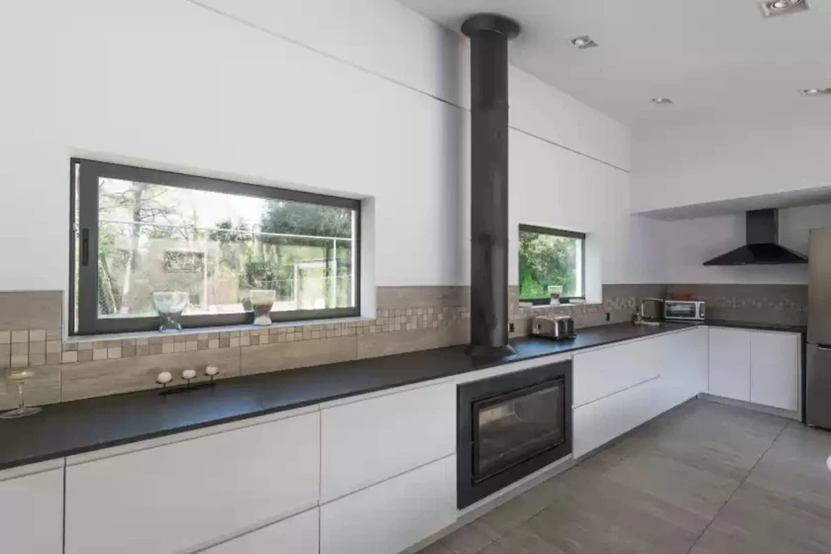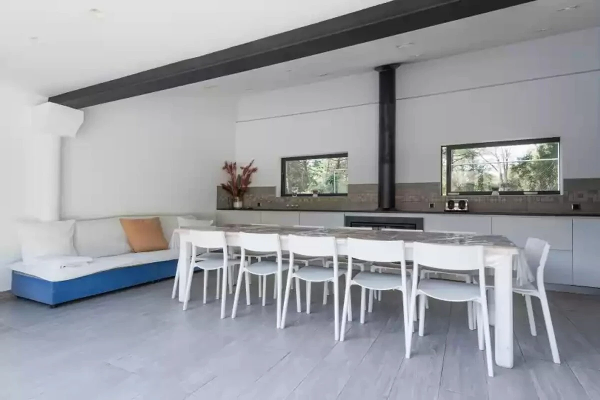 Die Außenanlage dieses wunderschönen Anwesens bietet den idealen Ort, um Ihren Urlaub zu verbringen und den 9 Meter langen und 4 Meter breiten Swimmingpool mit einer Tiefe von 1 bis 2,20 Metern zu genießen. Hier lassen Sie sich von der Sonne verwöhnen. Zudem finden Sie im Pavillon beim Pool eine voll ausgestattete Küche mit Induktionskochfeld und Kühlschrank sowie einem Gasgrill und einem dekorativen Holzbackofen. Eine separate Toilette, nur für den Außenbereich, ist ebenfalls vorhanden. Darüber hinaus gibt es ein Feld, um Volleyball zu spielen, sowie Rasenflächen und eine Veranda, mit gemütlichen Sofas, um ein gutes Buch lesen oder mit Freunden und Familie zu plaudern.