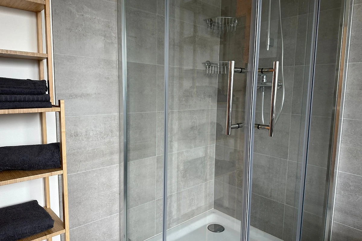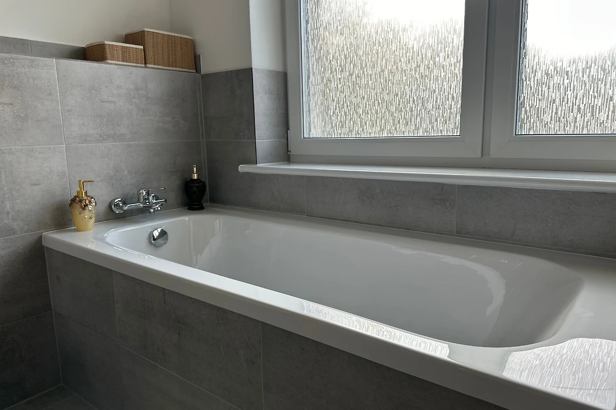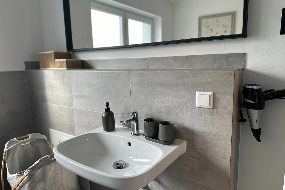 - Badezimmer mit Badewanne, Dusche und Fön sowie zusätzlichem Gäste-WC