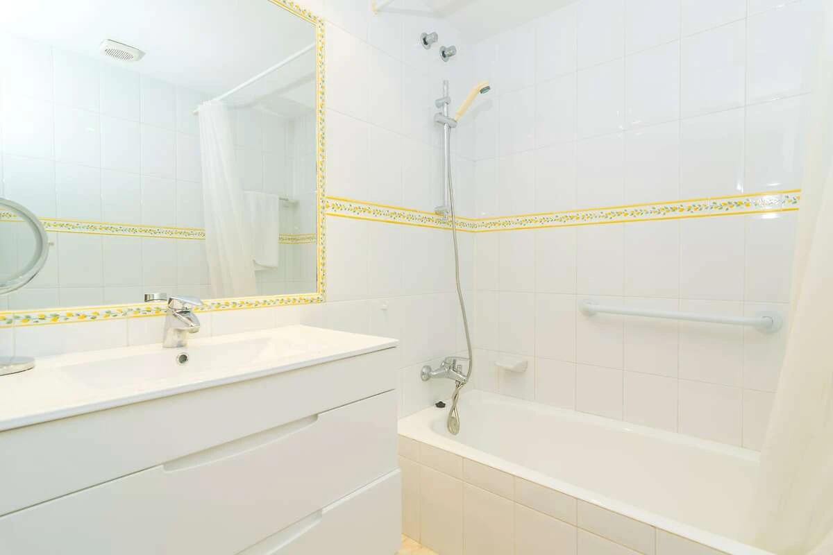 Das 80 m2 große Apartment liegt im Erdgeschoss (Stufen sind vorhanden) und hat 3 Schlafzimmer. 1 Schlafzimmer ist mit einem Doppelbett eingerichtet und hat das Bad mit Badewanne "en Suite", 1 Schlafzimmer hat 2 Einzelbetten und das 3te hat ein Etagenbett. Alle Schlafzimmer sind mit Klimaanlage ausgestattet. Ein Babybett und Hochstuhl kann auf Anfrage bereitgestellt werden. Außer dem "en Suite" Bad ist ein weiteres Duschbad vorhanden.