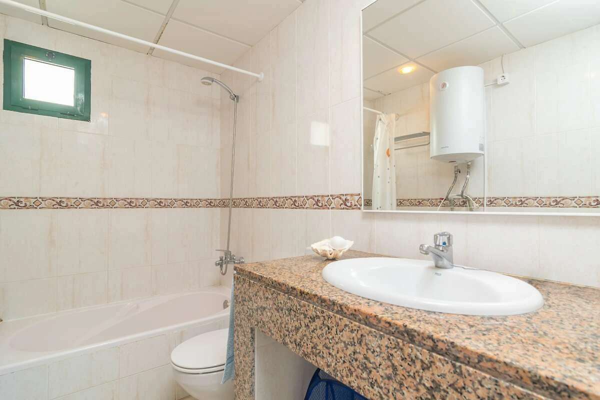 Die gepflegte Wohnanlage hat wunderschöne Gartenbereiche mit Liegen rund um den erfrischenden Gemeinschaftspool mit einer Größe von 10 x 4 Metern und einer Tiefe zwischen 0,85 und 1,45 Metern (er wird mit Chlor gereinigt). Die Kleinen werden sich über das Kinderbecken mit einem Durchmesser von 3 Metern und einer Tiefe von 0,45 Metern freuen. Die Wohnung befindet sich im Erdgeschoss und hat eine möblierte, private Terrasse, auf der Sie Ihre Mahlzeiten im Freien genießen. Es gibt direkte Nachbarn.