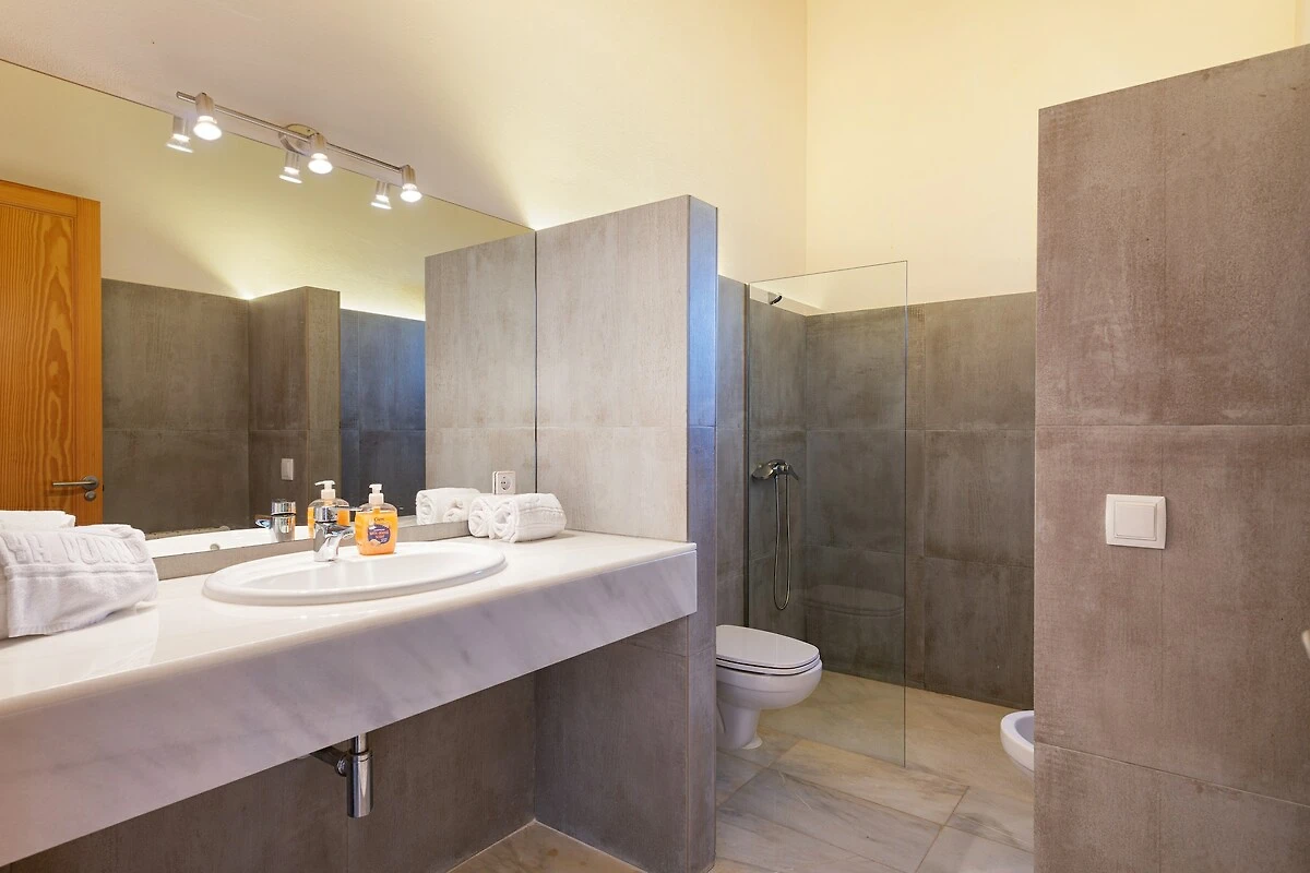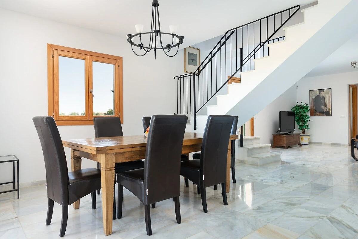 Die Räume verteilen sich auf 2 Etagen. Im Erdgeschoss betreten Sie ein geräumiges Wohn -Esszimmer, machen es sich auf dem Sofa bequem und schauen ein Programm im Sat TV. In der unabhängigen Küche gibt es einen 2ten Essbereich, einen Ausgang zur Terrasse, ein Cerankochfeld und alle notwendigen Utensilien, um bequem zu kochen. Nach abwechslungsreichen Urlaubstagen freuen Sie sich auf eines der insgesamt drei Schlafzimmer. Eines der Zimmer befindet sich im Erdgeschoss und verfügt über zwei Einzelbetten, Deckenventilator und Zugang zur Terrasse. Ein Badezimmer mit Dusche auf dieser Etage steht allen Bewohnern offen. Von den 2 Schlafzimmern im ersten Stock hat das erste ein Doppelbett und Zugang zur Terrasse, während das zweite Schlafzimmer über zwei Einzelbetten, Zugang zu einer weiteren Terrasse und ein eigenes Badezimmer mit Dusche verfügt. Ein weiteres Bad mit Dusche vervollständigt die Räumlichkeiten der ersten Etage. In der Unterkunft gibt es eine Waschmaschine, ein Bügeleisen und ein Bügelbrett. Das ganze Haus ist mit einer Zentralheizung ausgestattet. Wenn Sie mit Ihrem Baby reisen, können wir auf Anfrage ein Kinderbett und einen Hochstuhl zur Verfügung stellen.
