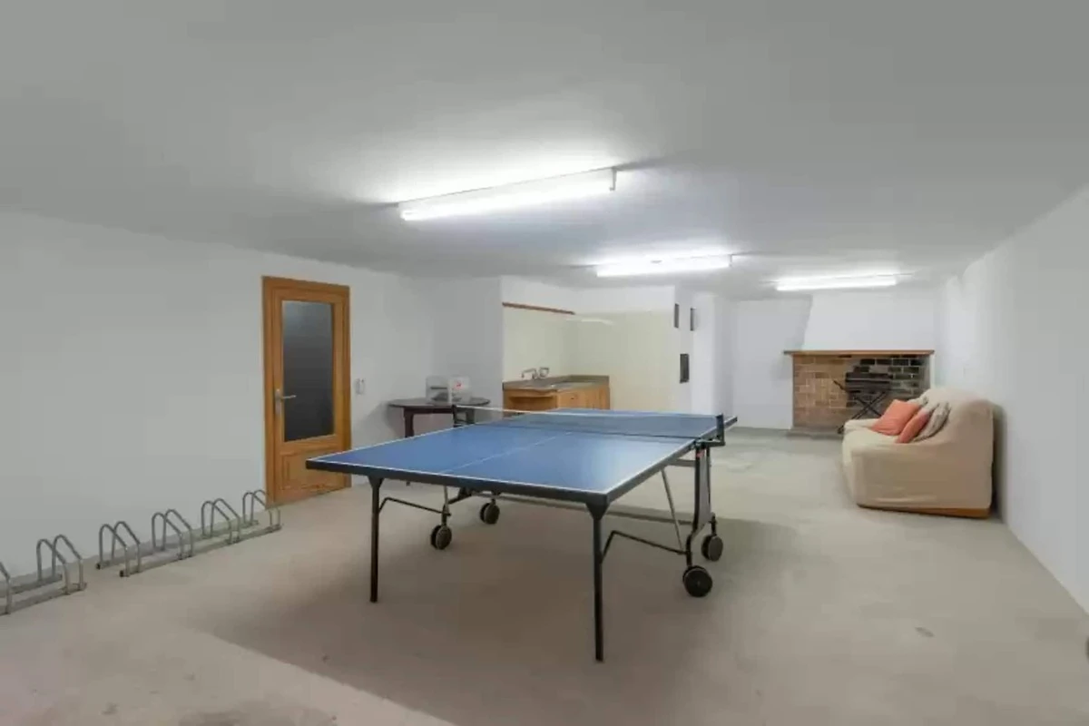 Im Inneren des Hauses finden Sie ein geräumiges und helles Wohn- und Esszimmer mit einem Sofa, das zusammen mit dem Smart-TV und der Klimaanlage den Aufenthalt angenehmer macht. Das gleiche Wohnzimmer verfügt über einen Esstisch für gemeinsame Mahlzeiten. Die separate Gasküche bietet alle notwendigen Utensilien für das Kochen während Ihres Aufenthalts in der Villa sowie einen weiteren Essbereich. In Bezug auf die Schlafzimmer gibt es insgesamt 3 Zimmer mit Schränken. Das Hauptschlafzimmer verfügt über ein Doppelbett und Platz für ein Kinderbett, falls Sie mit einem Baby anreisen. Dieses Schlafzimmer hat ein eigenes Bad mit Dusche (ohne Toilette). Die anderen beiden Schlafzimmer sind über einen Flur mit Klimaanlage verbunden, der die Zimmer kühlt. Eines davon hat ein Doppelbett, das andere hat zwei Einzelbetten. Schließlich verfügt die Villa über ein weiteres vollständiges Bad mit Dusche. Im Erdgeschoss gibt es einen Raum mit Tischtennisplatte und Parkplätze für Fahrräder. Darüber hinaus gibt es in der Küche eine Waschmaschine sowie ein Bügeleisen und ein Bügelbrett.