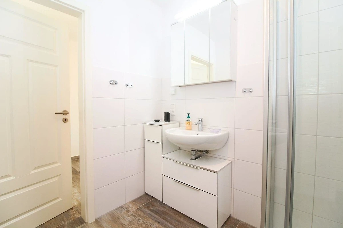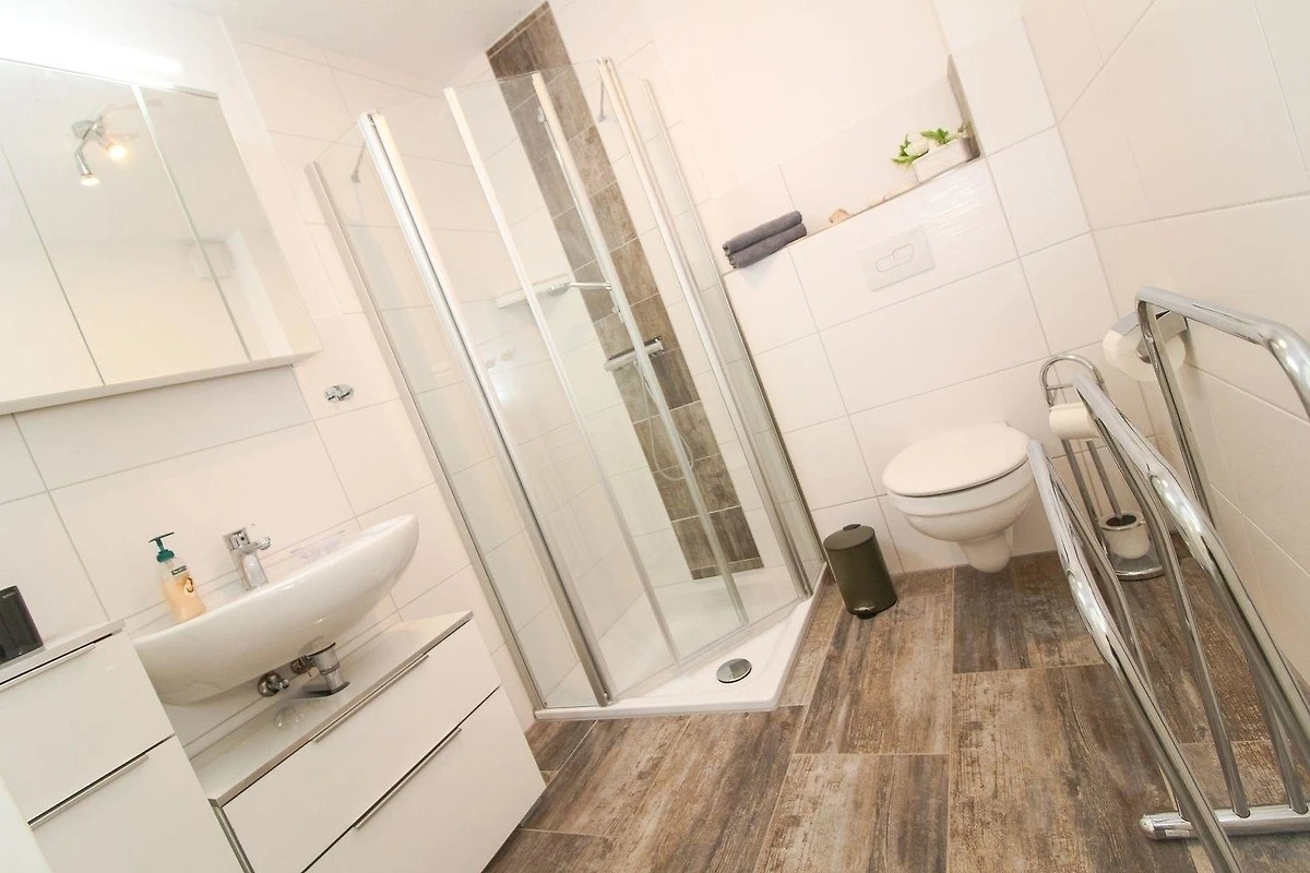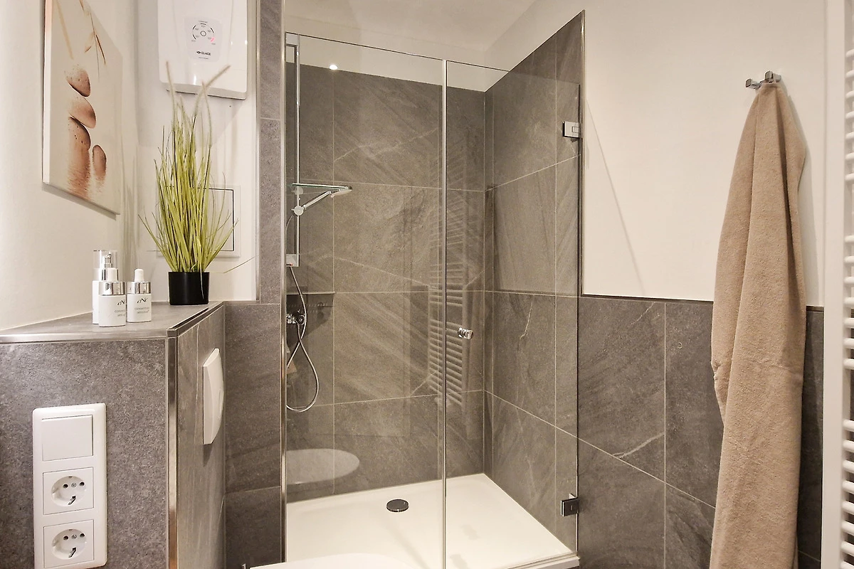 Anliegend befindet sich das hochwertige Badezimmer mit Dusche und WC.
