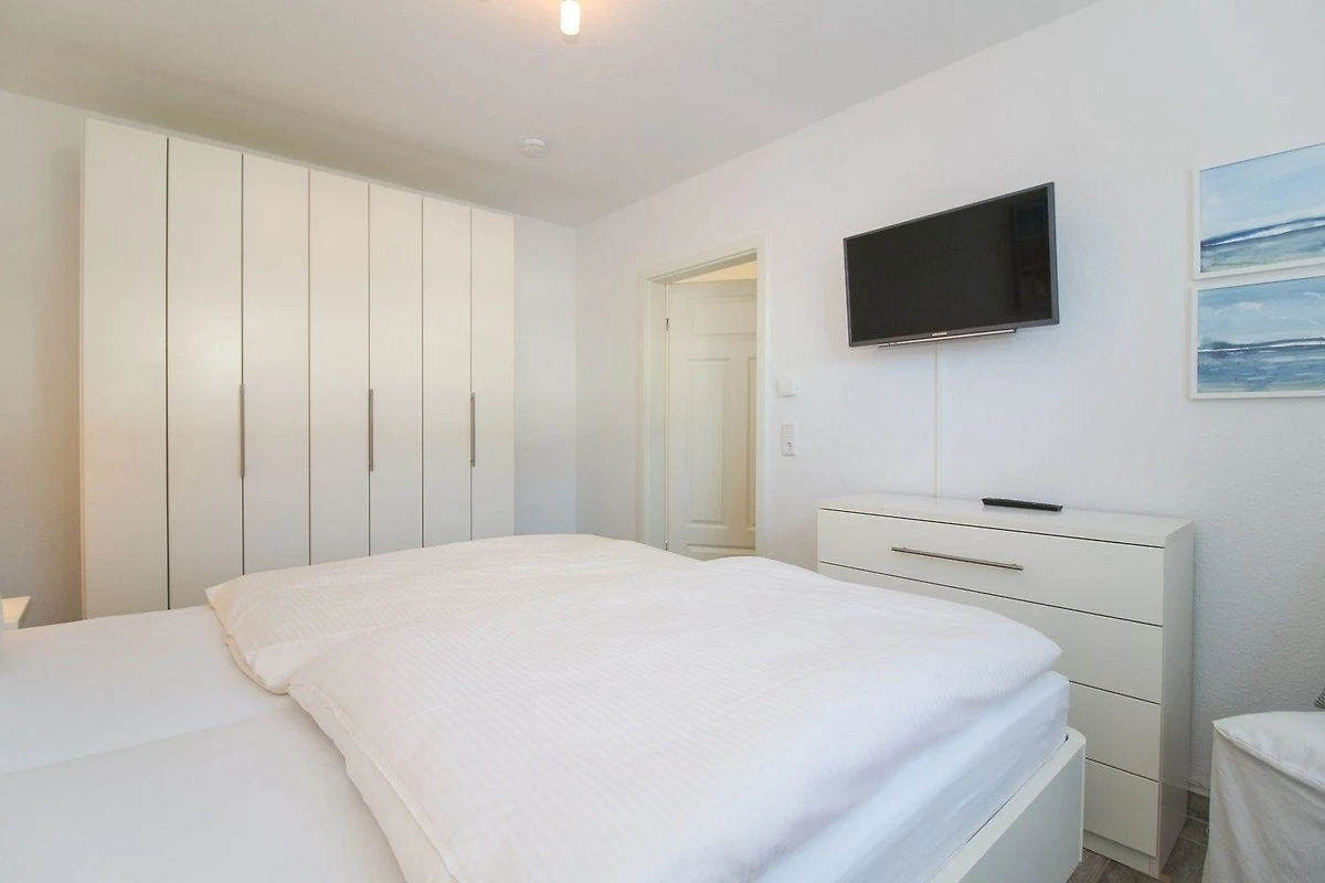 Die Wohnung verfügt über ein Schlafzimmer mit Doppelbett, Kleiderschrank und TV.