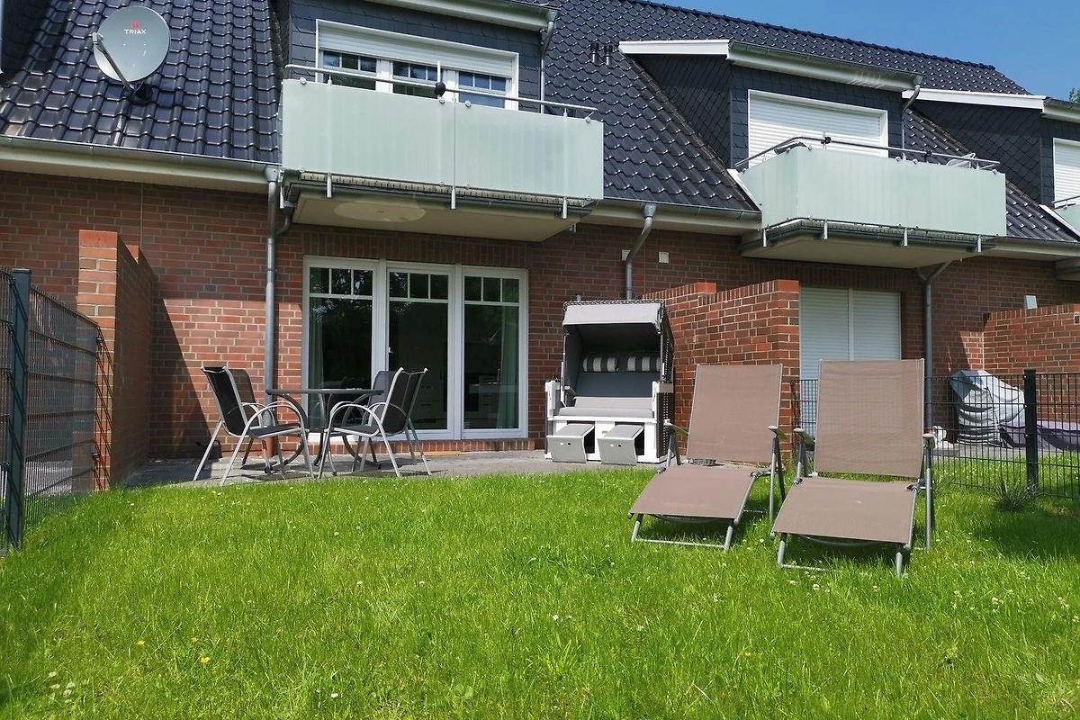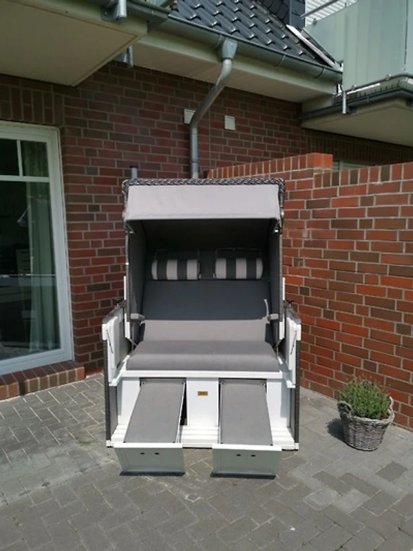 Über die Terrassentür im Wohnzimmer gelangen Sie nach draussen, hier empfängt Sie eine Terrasse in Süd/West Lage. Der Strandkorb im Garten lädt zum Entspannen ein. Der Gartenbereich ist eingezäunt.