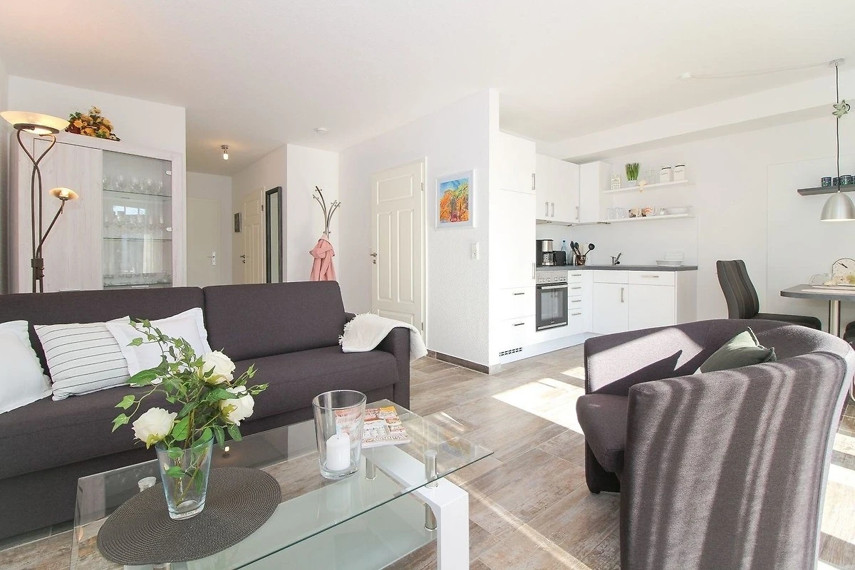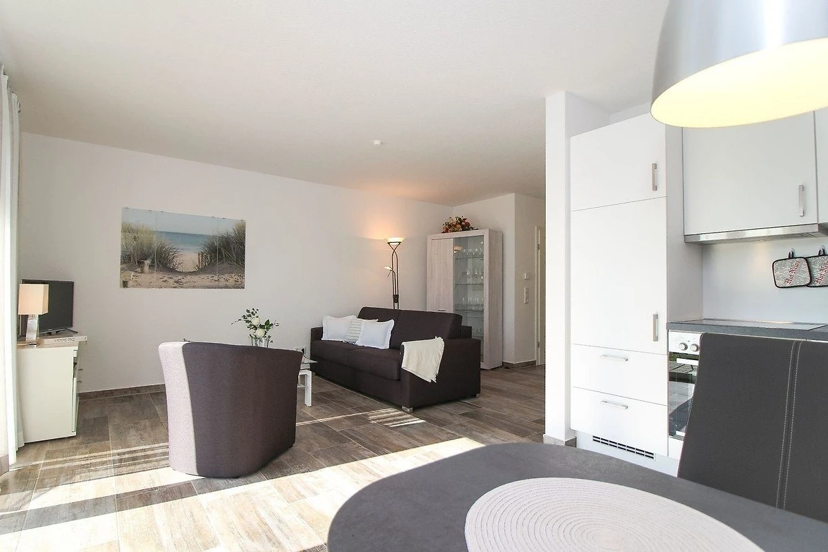 Der offene Wohnbereich teilt sich seinen Platz mit einer modernen Einbauküche und einen Essbereich. Auf dem Stoffsofa und dem dazugehörigen Sessel kann man den Tag ausklingen lassen.