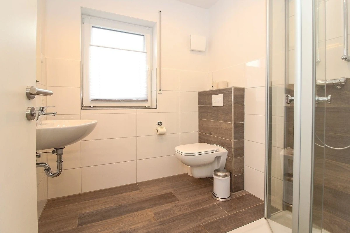 Das Bad rundet den Grundriss ab und bietet ein WC, Waschtisch und eine Dusche.