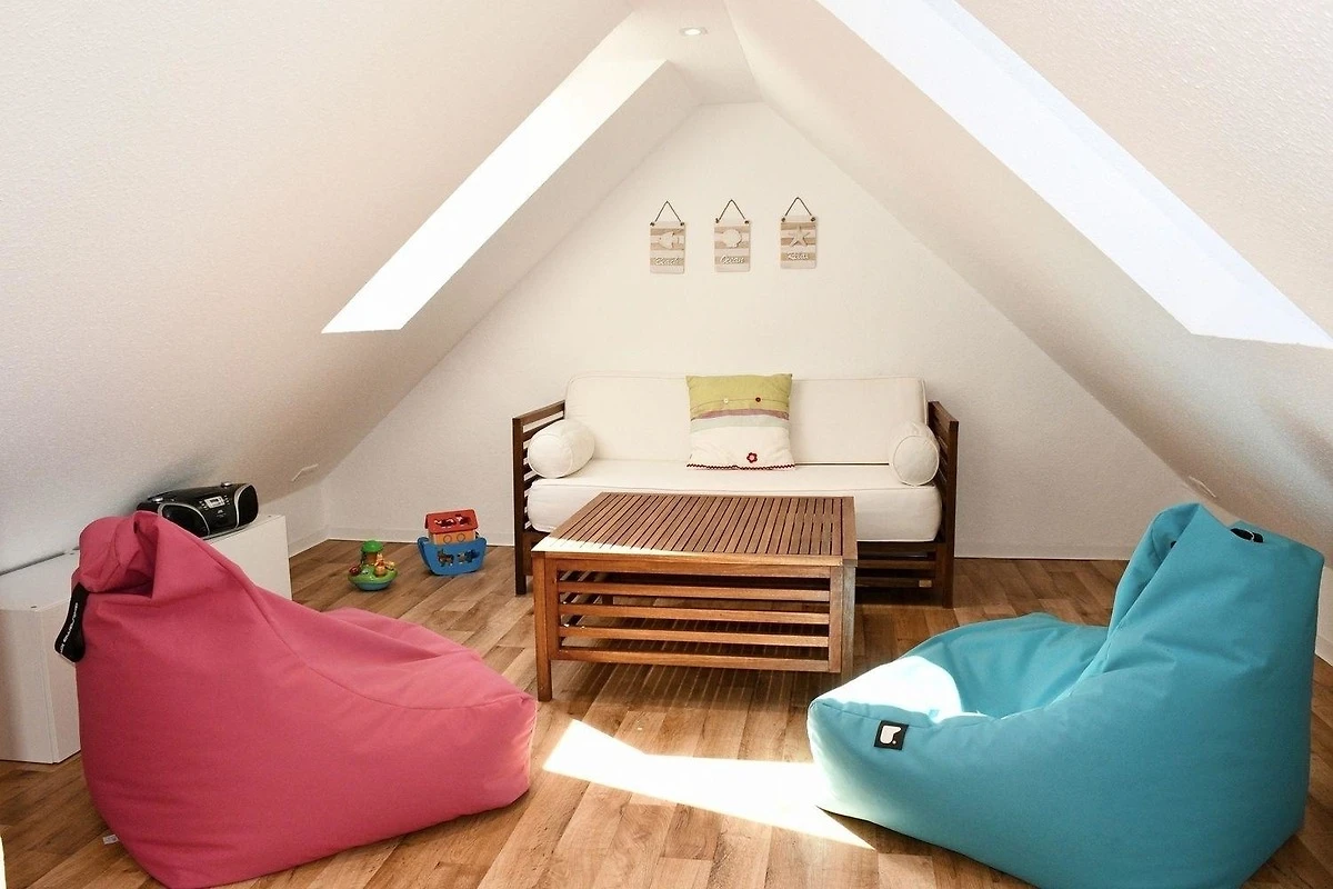 Der gemütlich eingerichtete Spitzboden kann gerne als Spiel- oder Lesezimmer genutzt werden.