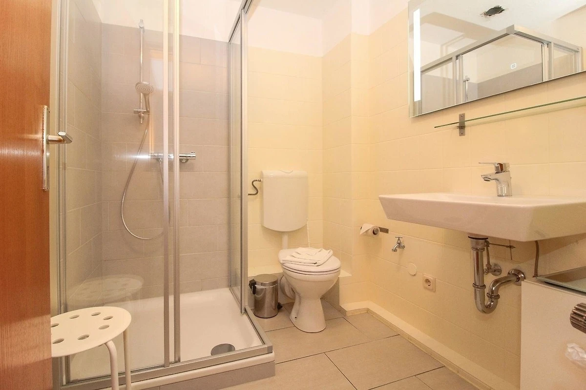 Das Badezimmer verfügt über ein WC, ein Waschtisch udn eine Dusche.