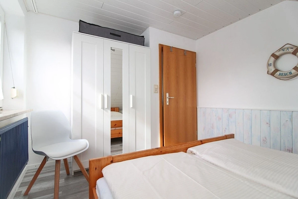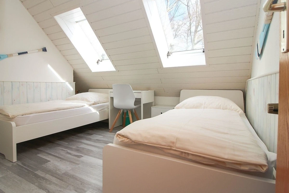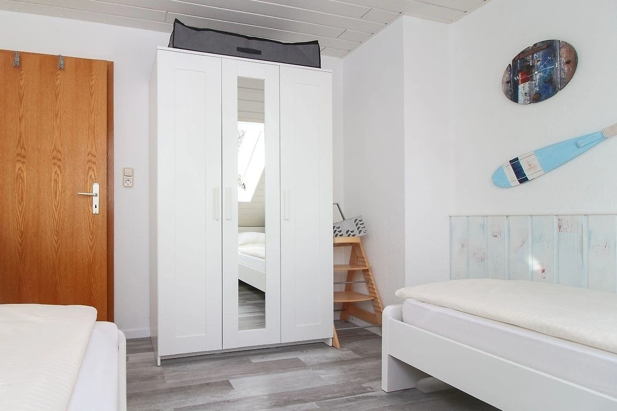 Das zweite Schlafzimmer beinhaltet zwei Einzelbetten und ebenfalls einen Kleiderschrank.