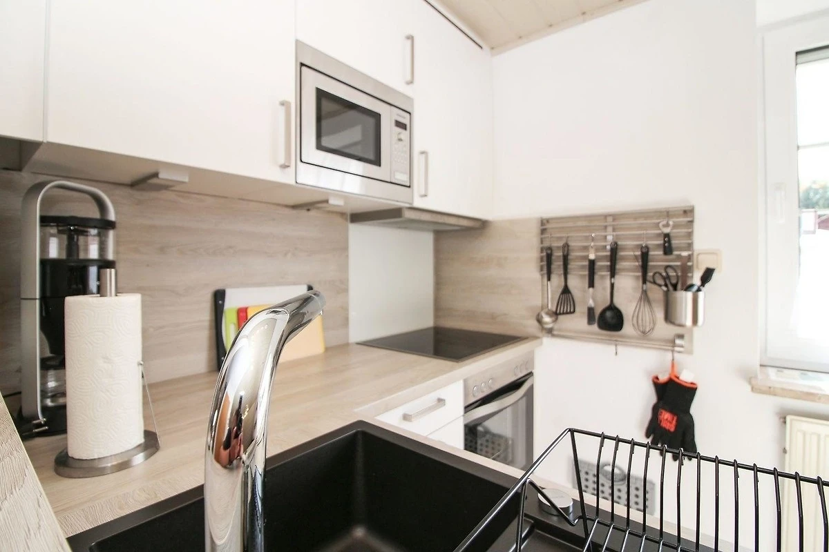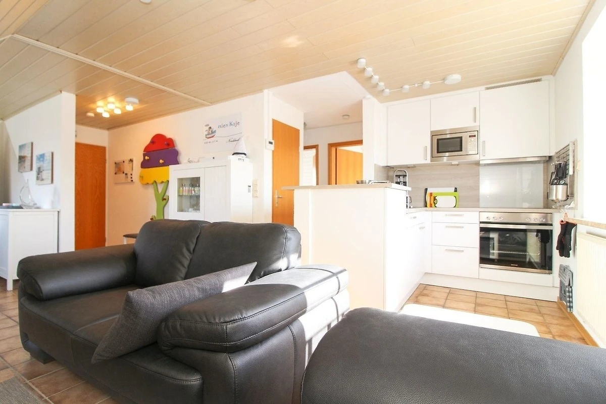 Die neuwertige Küche ist mit einem Herd (Ceranfeld), Backofen, einer Mikrowelle, Kühlschrank mit Gefrierfach und einer Spülmaschine ausgerüstet. Zur weiteren Ausstattung gehören eine Kaffeemaschine, Wasserkocher, Toaster sowie ausreichend Geschirr für 4 Personen.