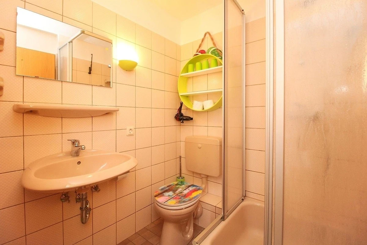 Das innenliegende Bad ist mit einem Waschtisch und einer Dusche ausgestattet.