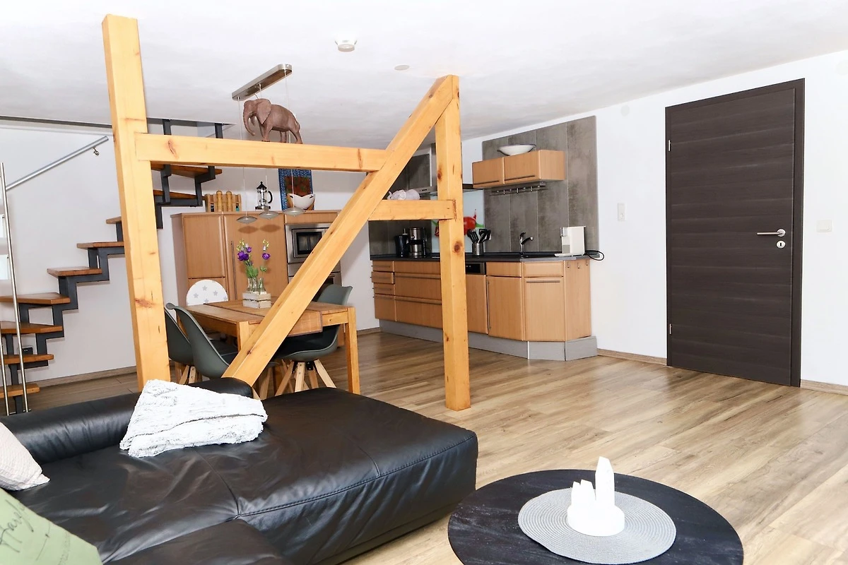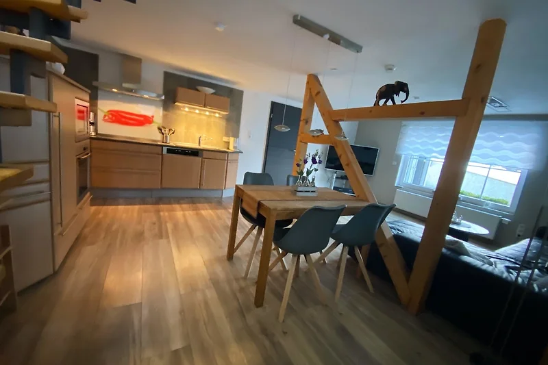 Verbringen Sie Ihren Urlaub im geschmackvollen Ambiente: Wohnbereich mit offener Küche, 2 Schlafzimmer, 1 Badezimmer mit Dusche sowie ein 2. WC im Obergeschoss .