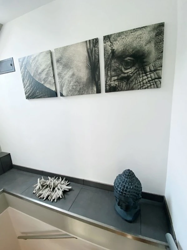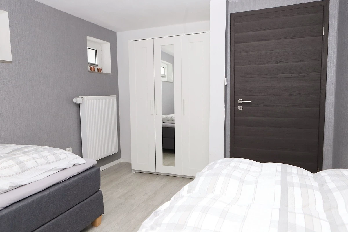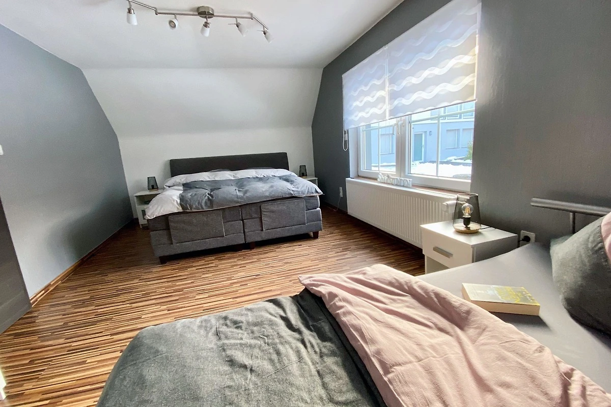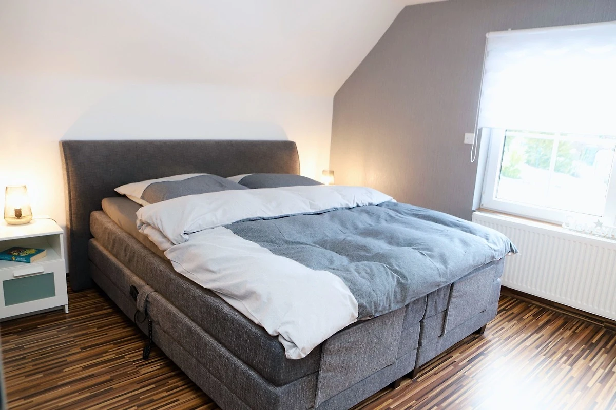 Im Obergeschoss befindet sich ein exklusives Boxspringbett mit elektrischer Verstellung (180x200 cm) sowie ein Einzelbett in 120x200 cm.