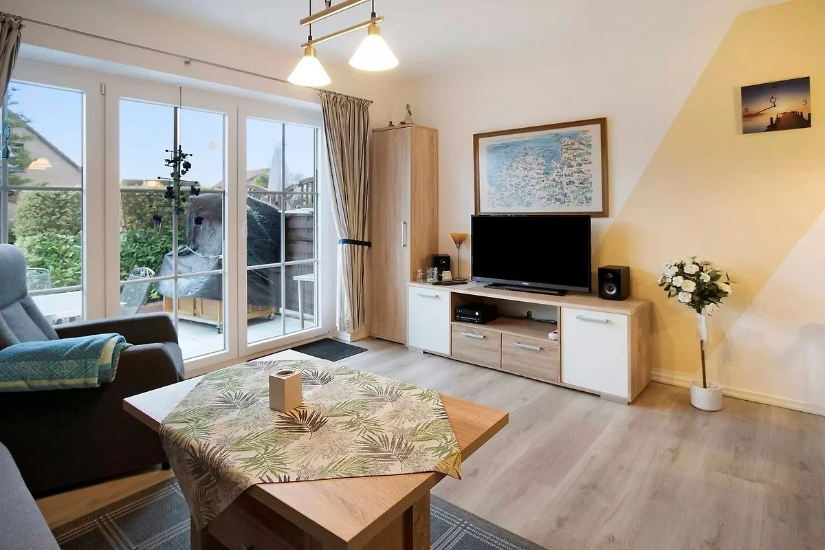 Das Besondere an dieser Unterkunft ist der private Aussenbereich mit Garten, Gartenmöbeln, Strandkorb und überdachter Terrasse.