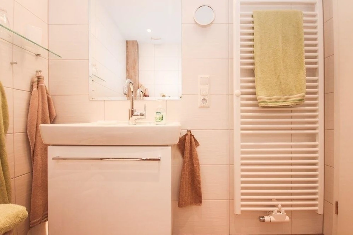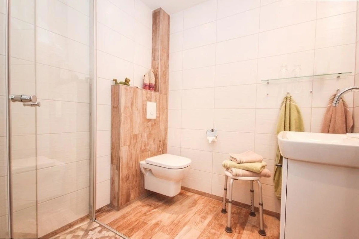 Das barrierefreie Badezimmer ist mit allen Annehmlichkeiten wie Kosmetikspiegel, Handtuchheizkörper, Waschbecken mit Unterschrank und Fön ausgestattet.