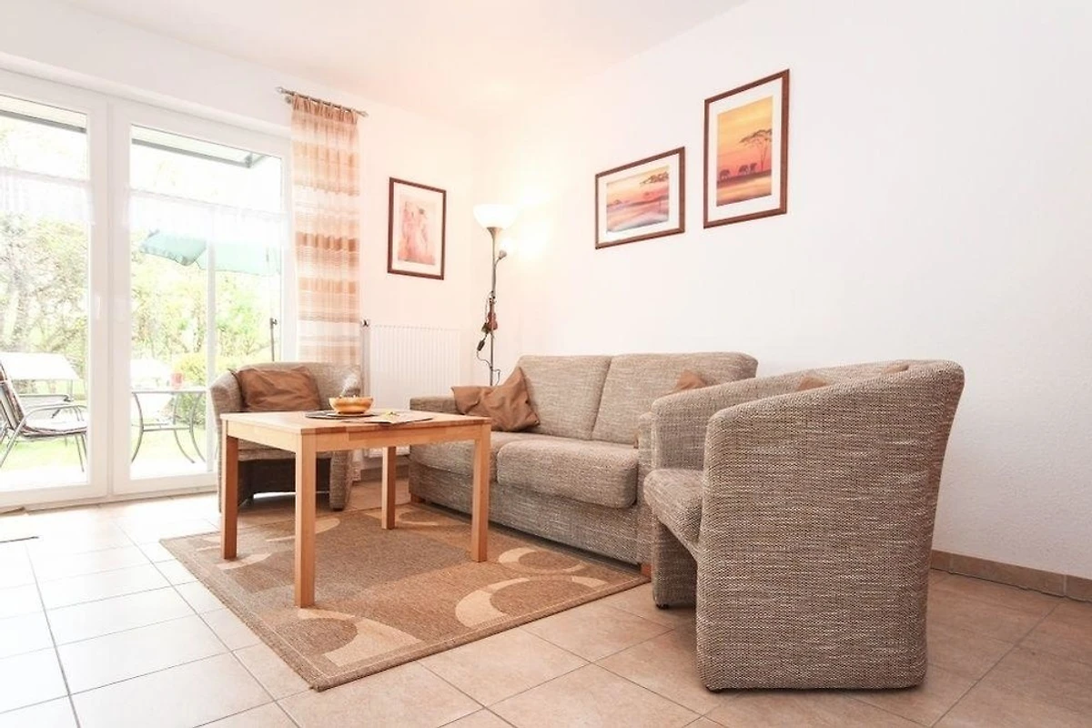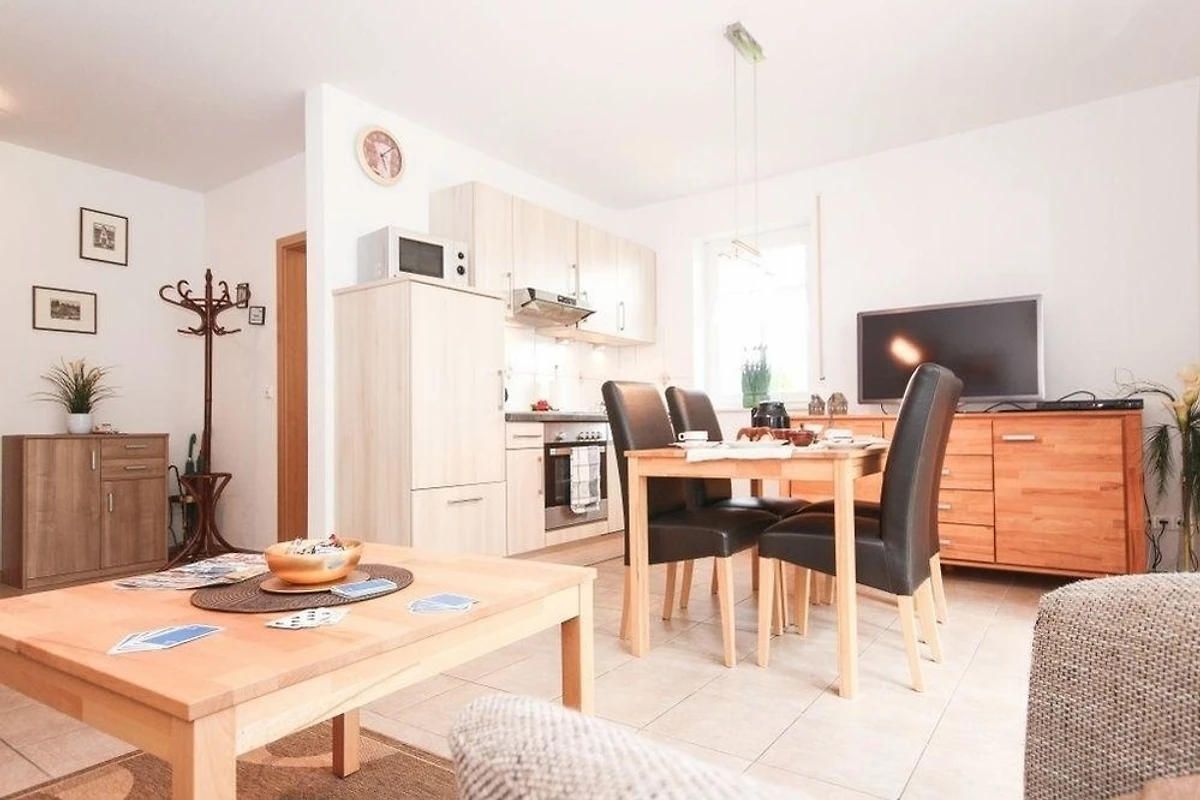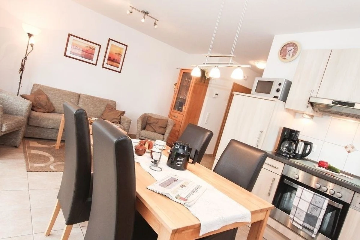 An den Küchenbereich mit vollausgestatteter Einbauküche (Mikrowelle, Geschirrspüler, Kühlschrank mit Eisfach, Toaster, Kaffeemaschine, Wasserkocher...) schliesst sich mit einem Tisch und vier Stühlen der Essbereich an. Im Wohnzimmer können Sie es sich auf der hochwertigen Schlafcouch( Liegefläche 2,12 x1,50 m) oder auf den Sesseln gemütlich machen und auf dem grossen Flachbildschirm-TV einen schönen Spielfilm ansehen.