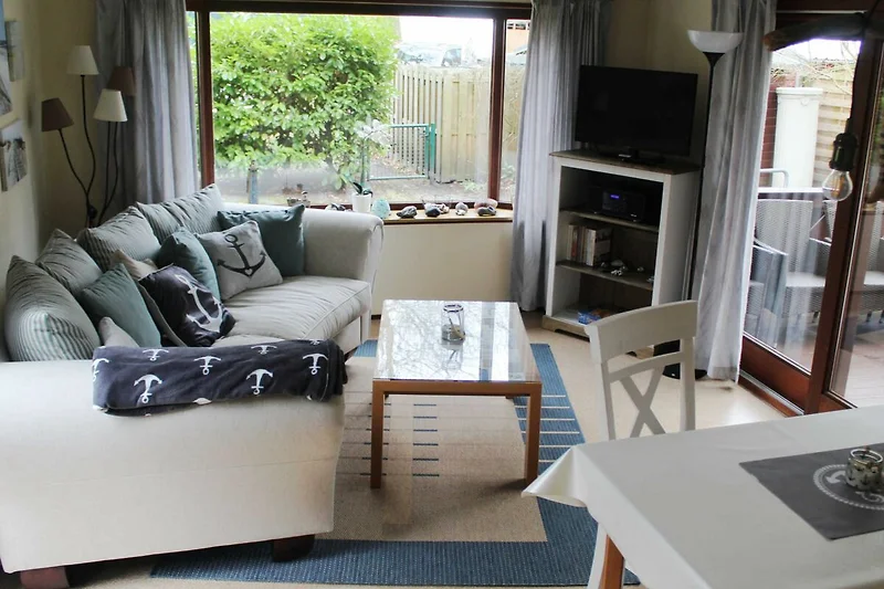 Das gemütliche Wohnzimmer mit einer Essecke und einer Couch ist u.a. mit einer Mini-Stereo-Anlage, einem Flachbild-TV und einem DVD-Player ausgestattet.
