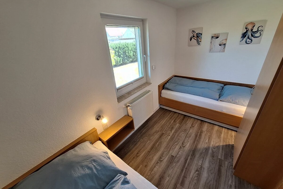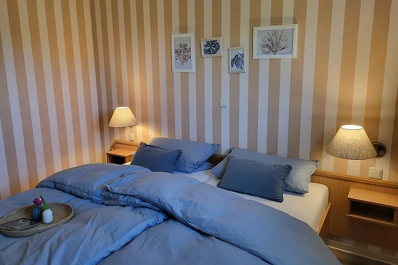 Schlafräume: Zwei gemütliche Schlafräume ein Raum mit einem Doppelbett (DB) und ein weiterer mit zwei Einzelbetten (EB) bieten ausreichend Platz für bis zu vier Personen.