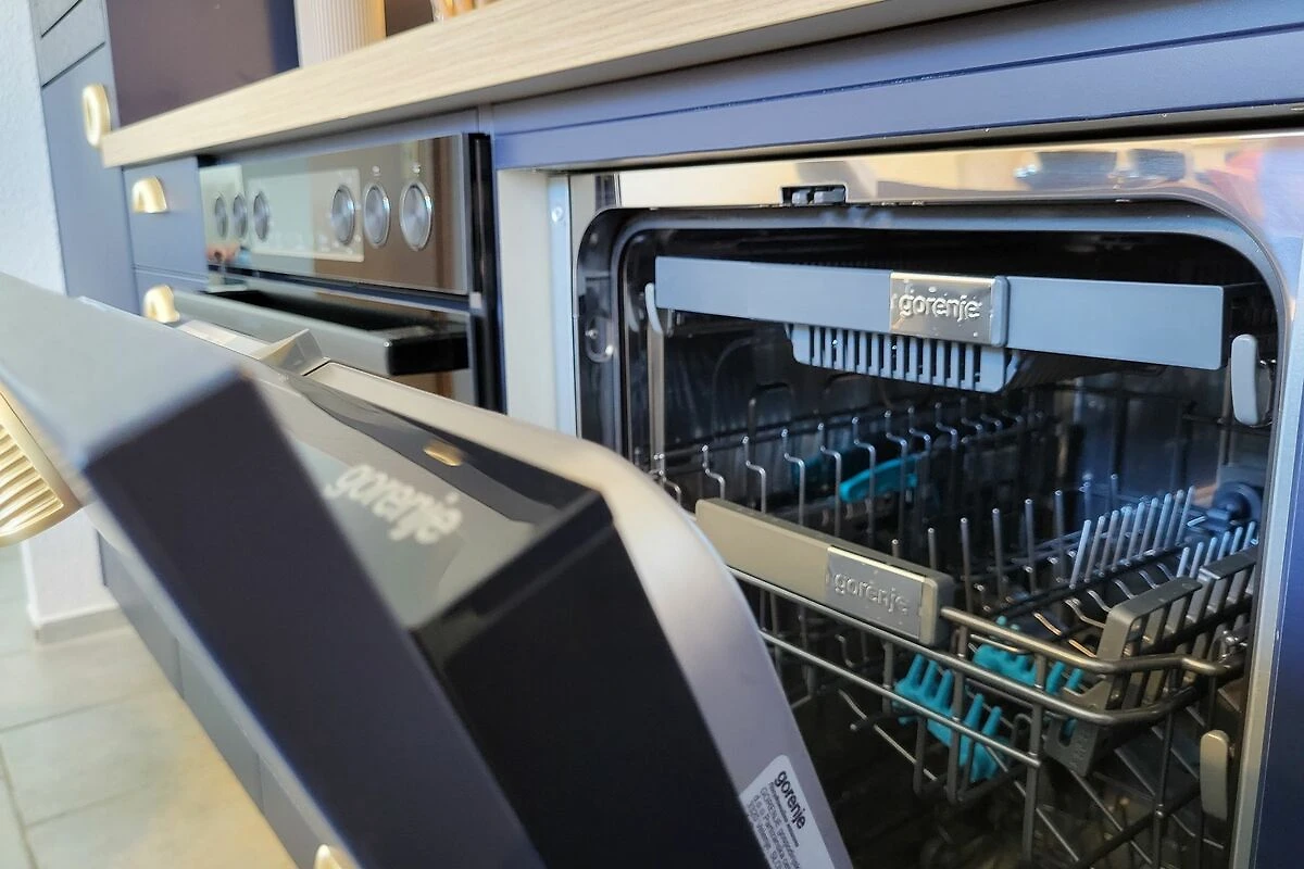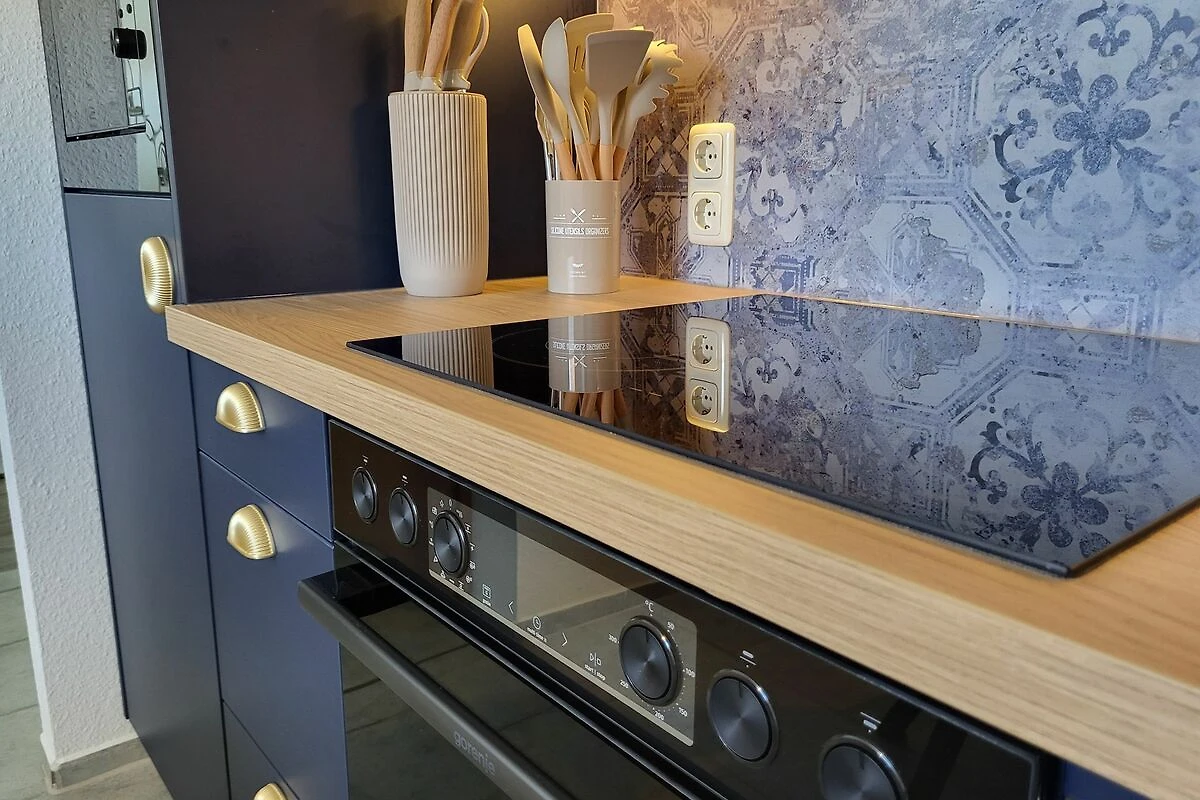 Küche: Die funktionale Küchenzeile ist mit einem Herd und einer Mikrowelle ausgestattet, sodass Sie mühelos leckere Mahlzeiten zubereiten können.