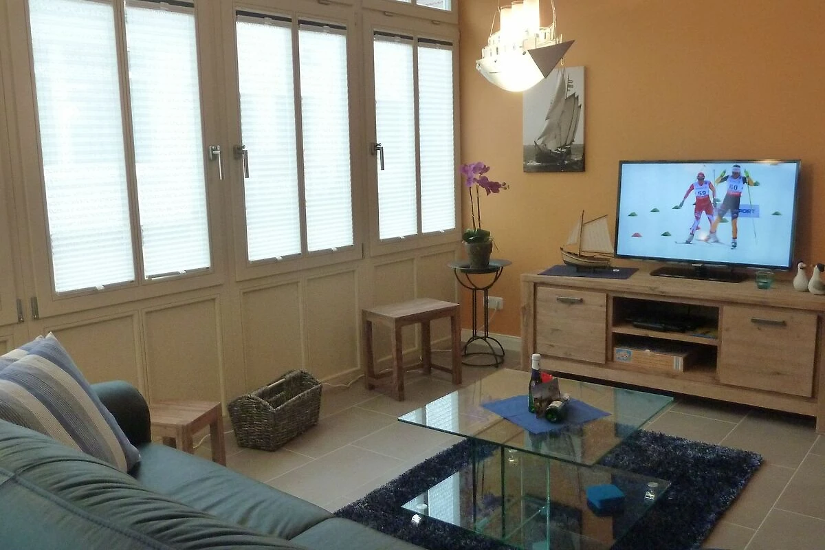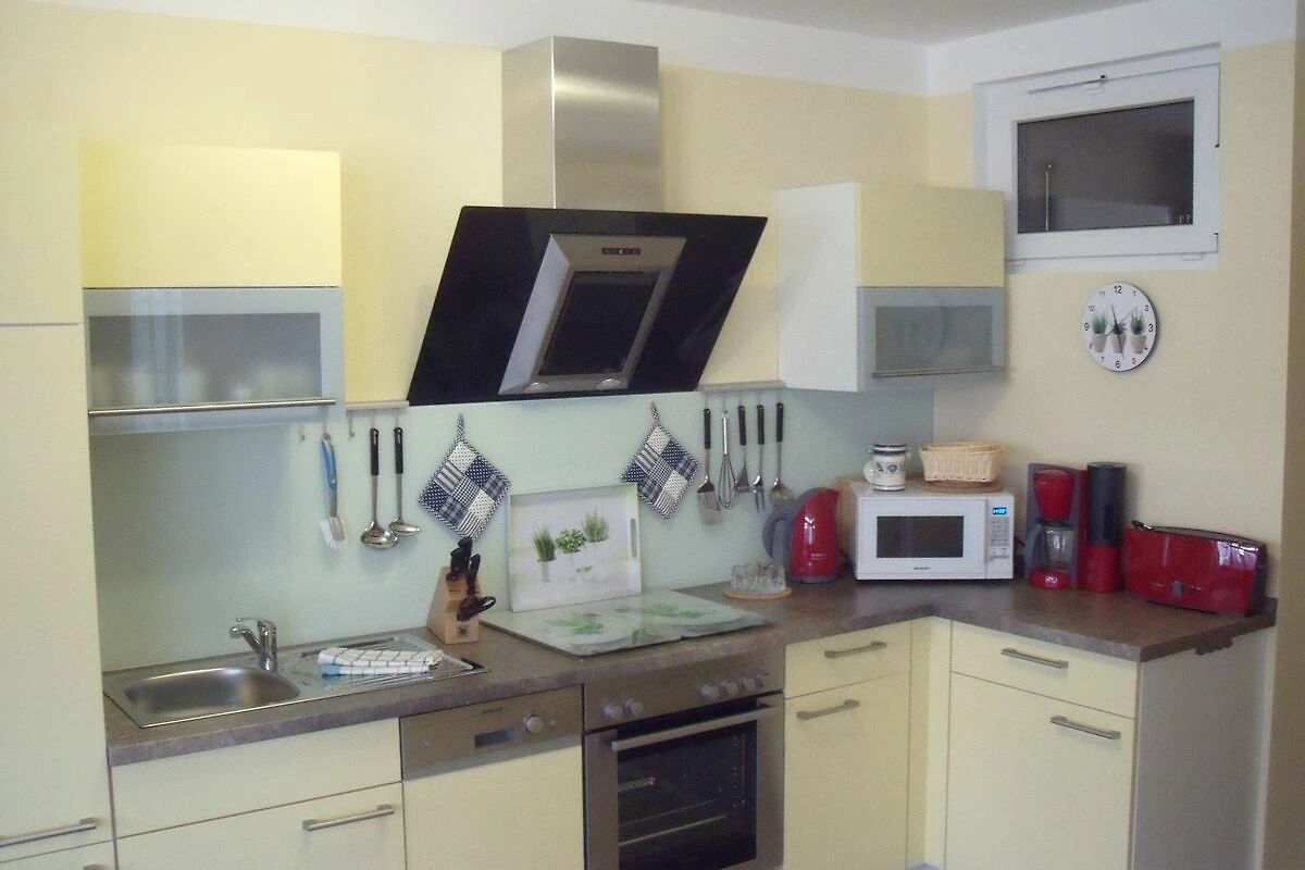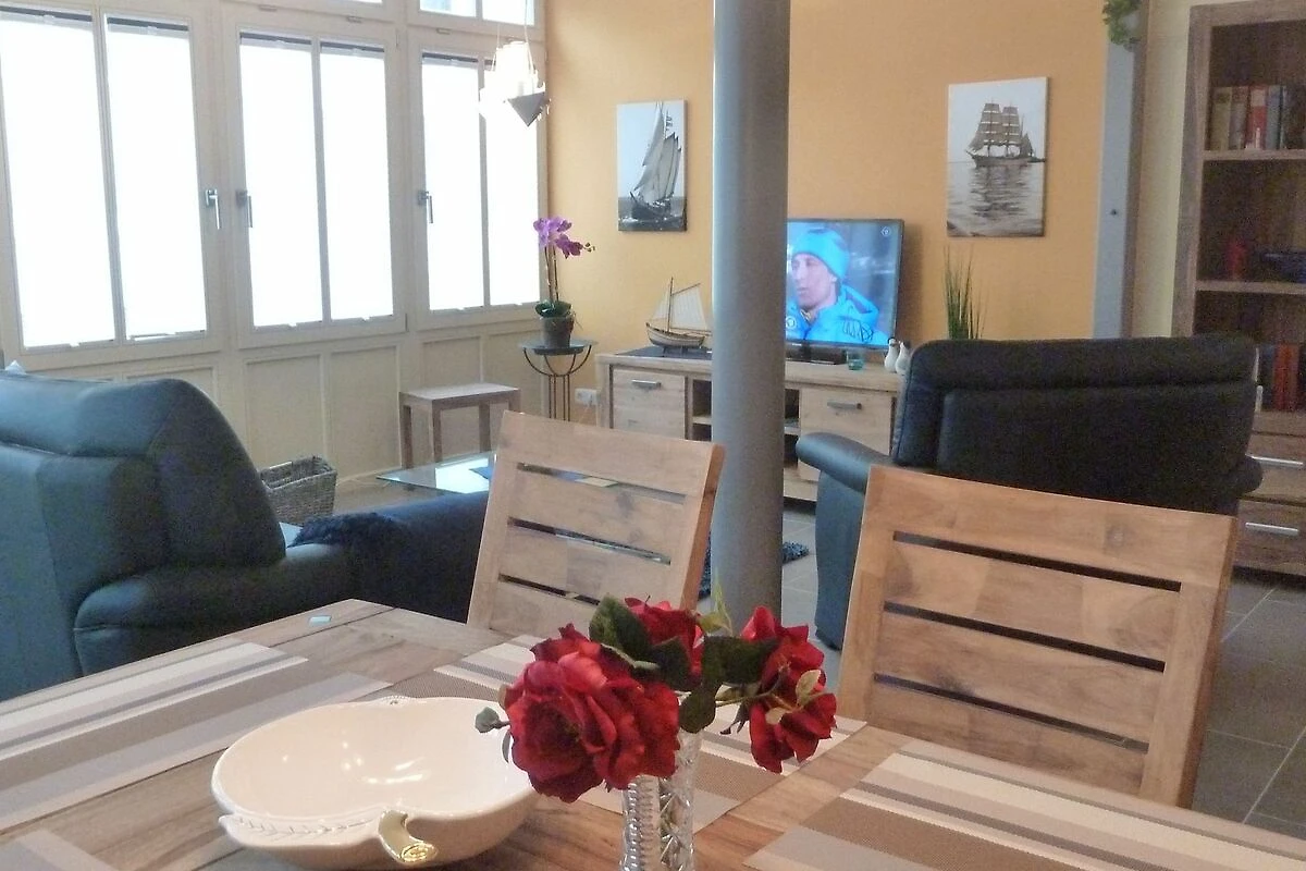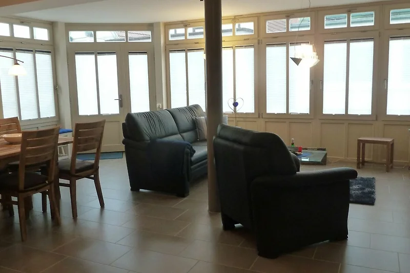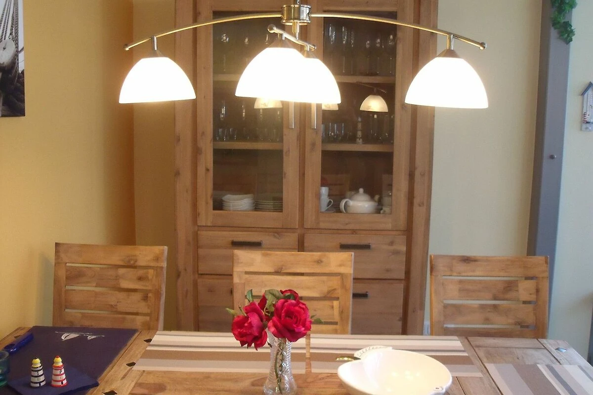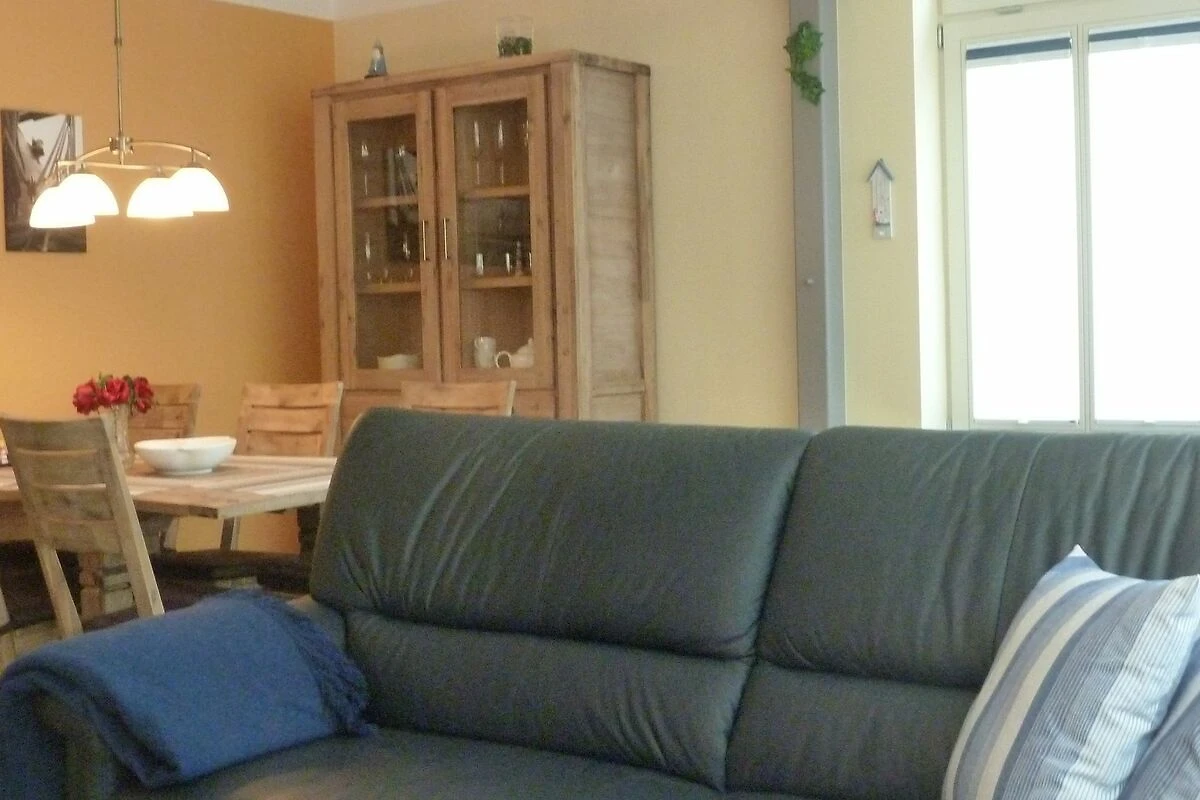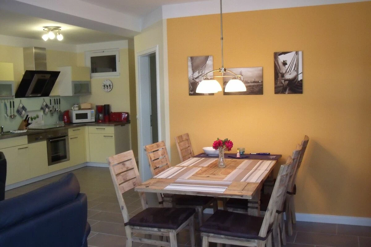 Die ebenerdige 69qm grosse Wohnung für 2 bis 4 Personen ist gemütlich eingerichtet und verfügt über eine grosszügiges Wohn-/ Esszimmer mit integrierter, voll ausgestatteter Küchenzeile. Hier stehen ihnen ein Esstisch für Ihre Mahlzeiten und eine gemütliche Sofaecke mit Flachbildfernseher und Blue Ray Player zur Verfügung.