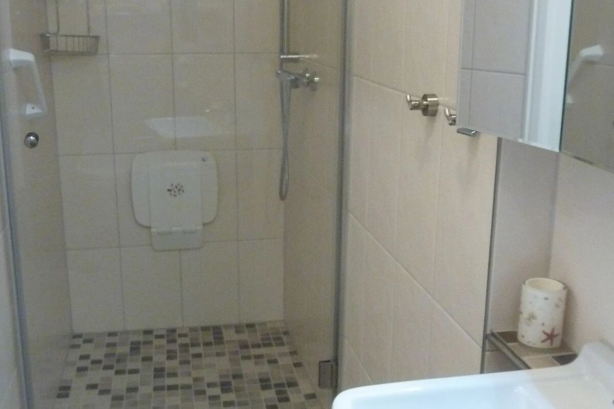 Das Badezimmer verfügt über eine begehbare Dusche mit Sitz und Waschbecken ohne Unterschrank.