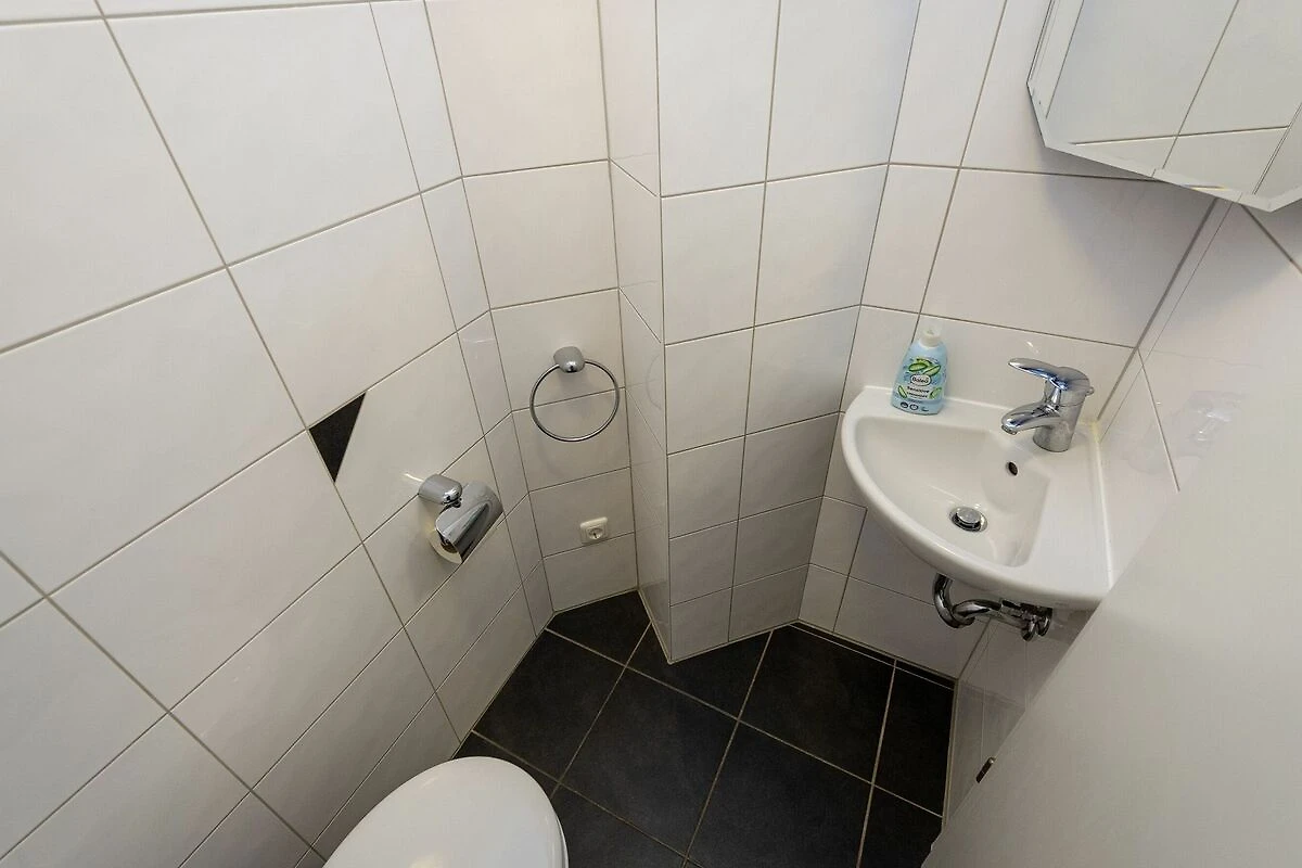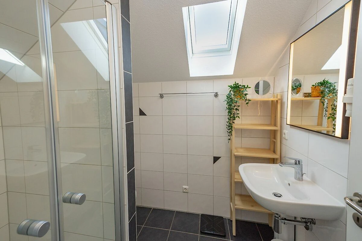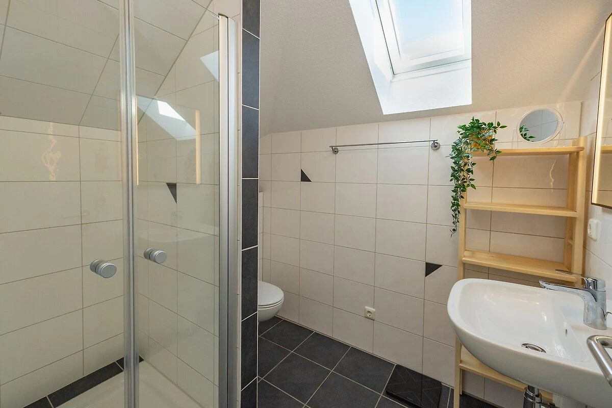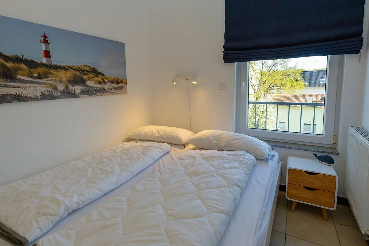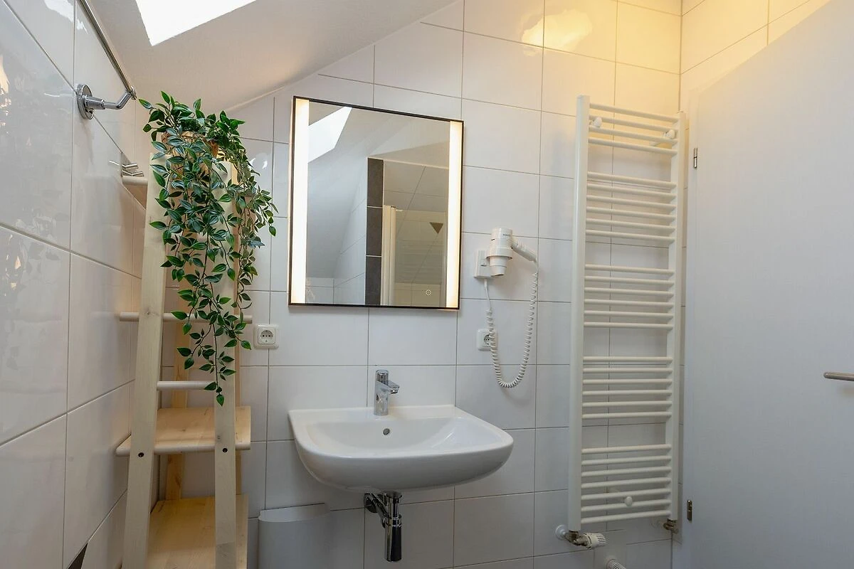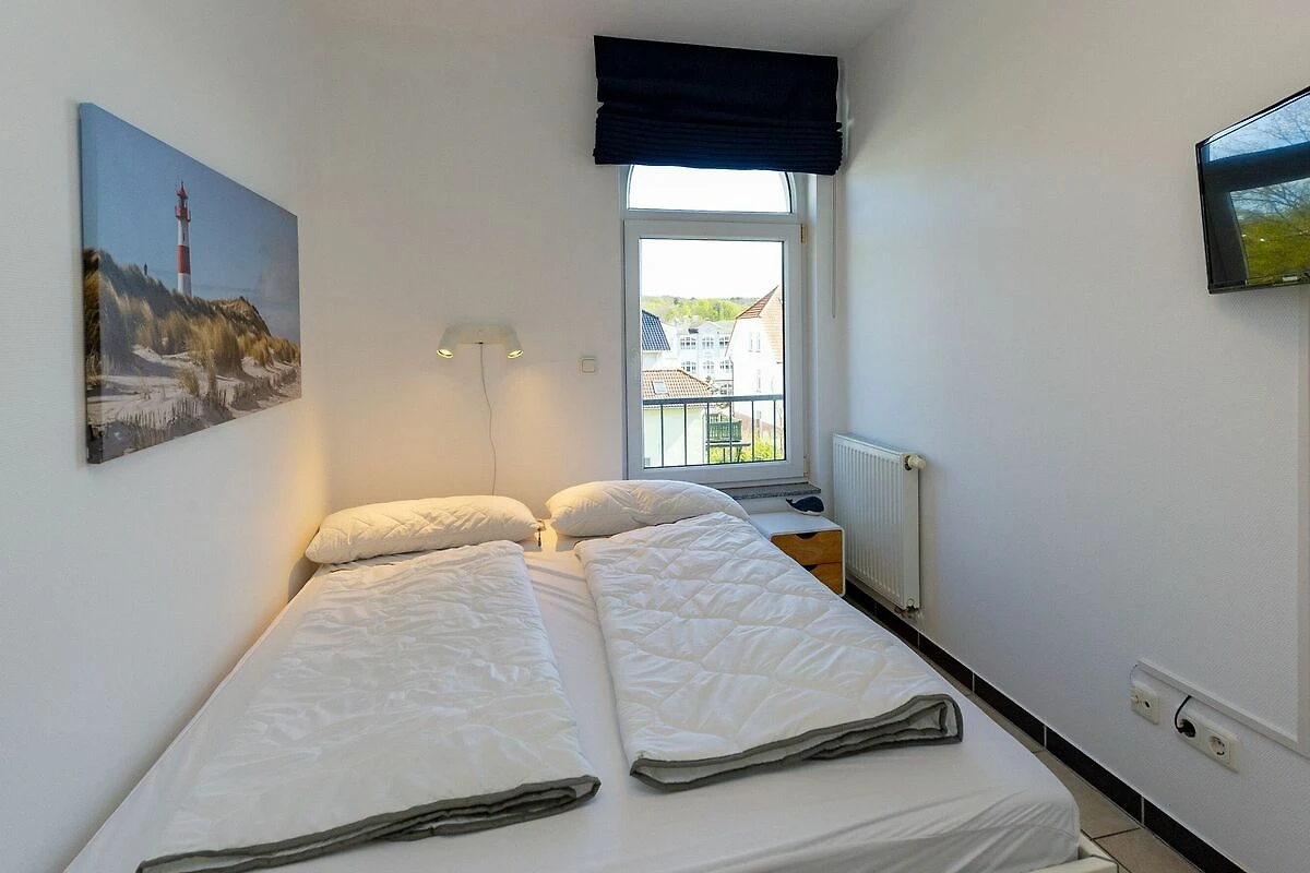 Ein paar Treppenstufen höher finden Sie unter leichten Dachschrägen das zweite Schlafzimmer - ebenfalls ausgestattet mit einem Doppelbett, einem Kleiderschrank und Fernseher - sowie das Badezimmer mit Dusche/WC, Waschtisch und Fön.