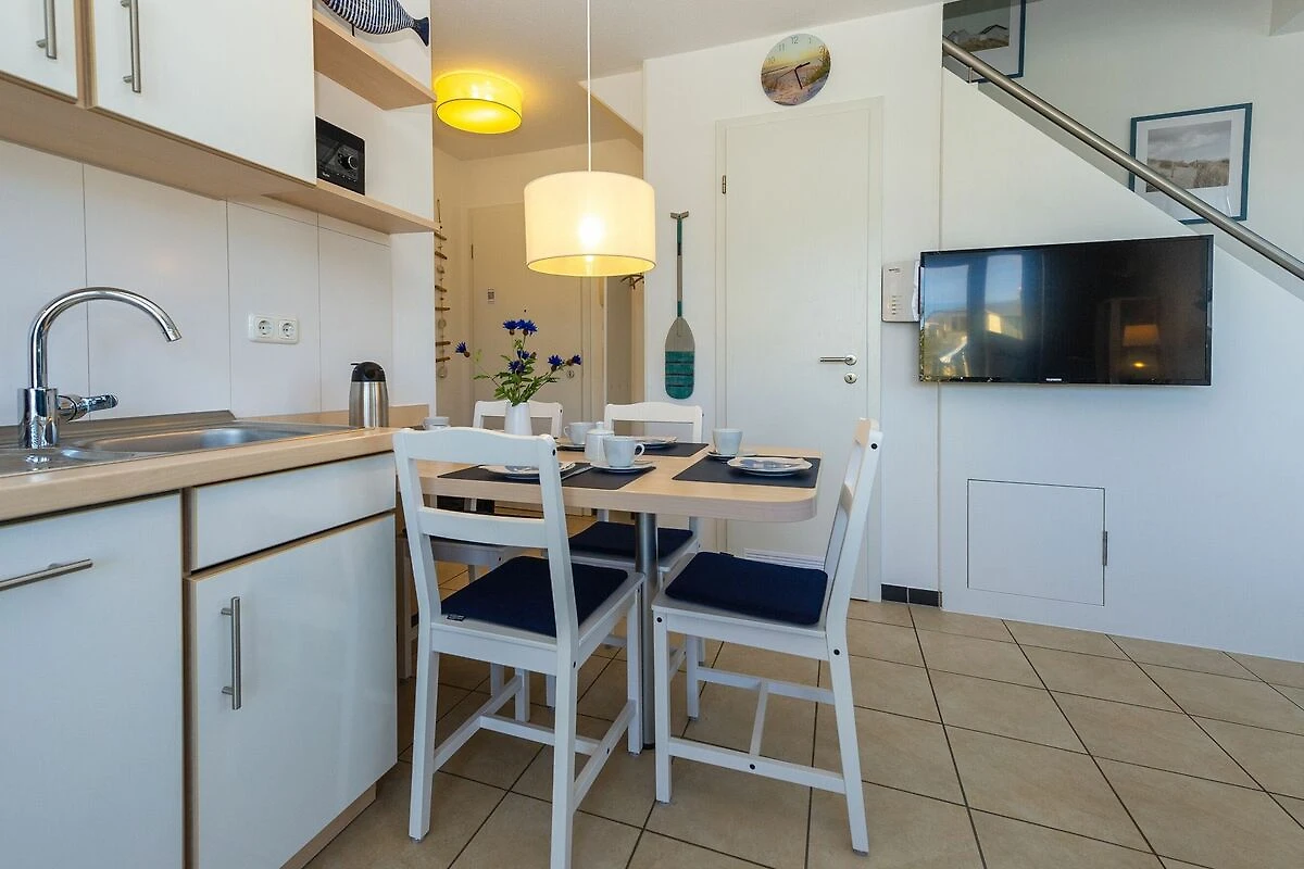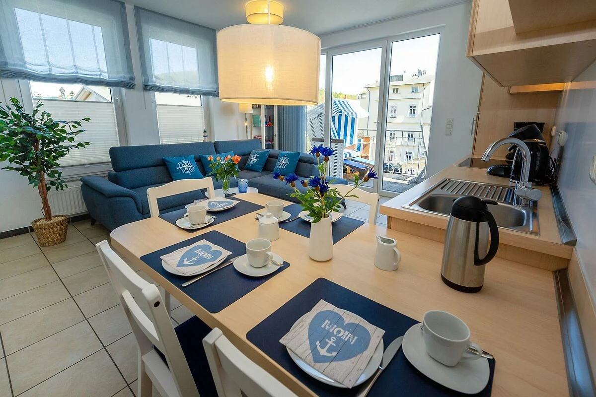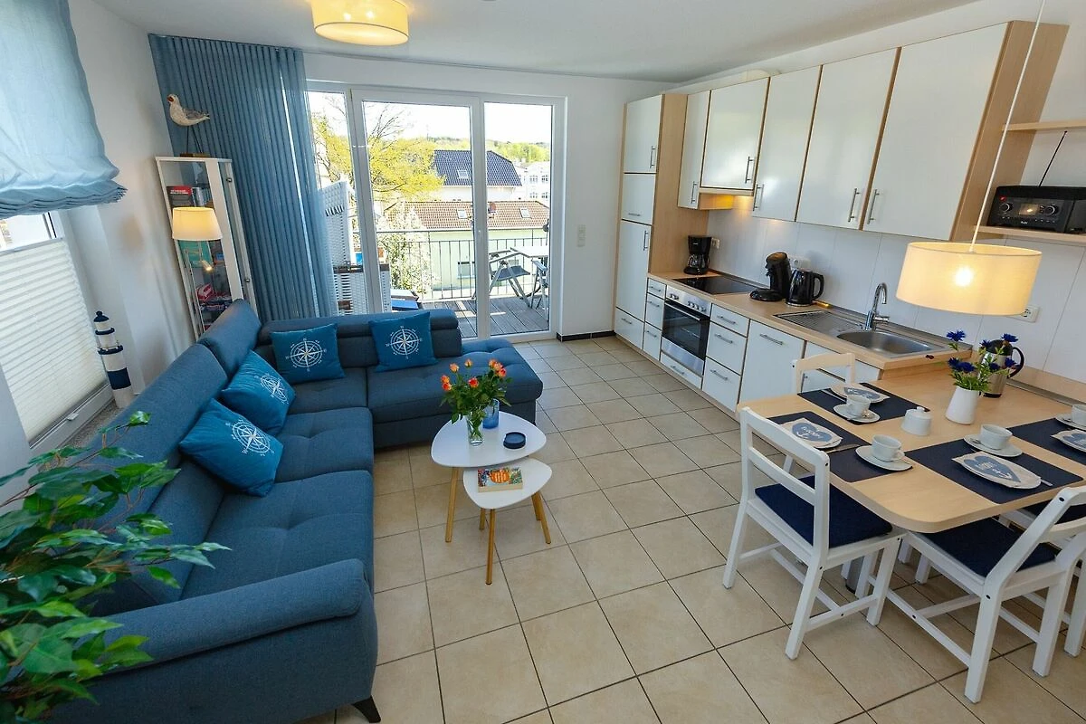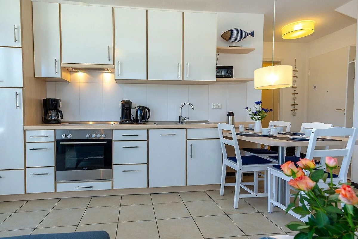 Die offene Küche verfügt über einen 4-Zonen-Ceranherd mit Backofen, einen Kühlschrank mit Gefrierfach, eine Spülmaschine, eine Mikrowelle sowie Kaffeemaschine, Wasserkocher und Toaster. Natürlich sind auch ausreichend Koch- und Essgeschirr und weiteres nützliches Kleininventar vorhanden. Bis zum nächsten Bäcker für die frischen Frühstücksbrötchen sind es nur rund zwei Gehminuten. Speisen können Sie ganz nach Belieben entweder am grossen Esstisch im Wohnzimmer oder draussen auf dem Balkon, der zur sonnigen Südost-Seite ausgerichtet ist.