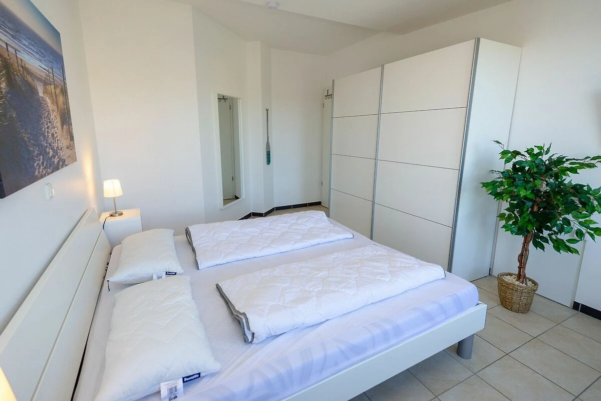 Das Gäste-WC und eines Ihrer beiden Schlafzimmer befinden sich ebenfalls auf dieser Etage. Letzteres ist mit einem komfortablen Doppelbett, einem Kleiderschrank für Ihre Urlaubsgarderobe und einem zusätzlichen Fernsehgerät ausgestattet.