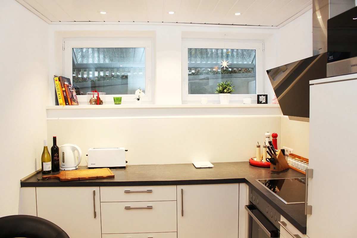 Im Souterrain befindet sich das grosszügige Wohn-Esszimmer mit Blick in den Garten. Von dort führt auch eine Treppe ins Erdgeschoss, wo Ihnen neben dem geräumigen Schlafzimmer eine kleine Leseecke zur Verfügung steht. Die moderne Küche im Erdgeschoss ist voll ausgestattet und verfügt über einen zusätzlichen kleinen Essplatz. Direkt nebenan befindet sich das Bad mit Dusche und WC. WLAN, eine Waschmaschine sowie eine Wallbox zum Laden von E-Autos stehen Ihnen zur Verfügung.
