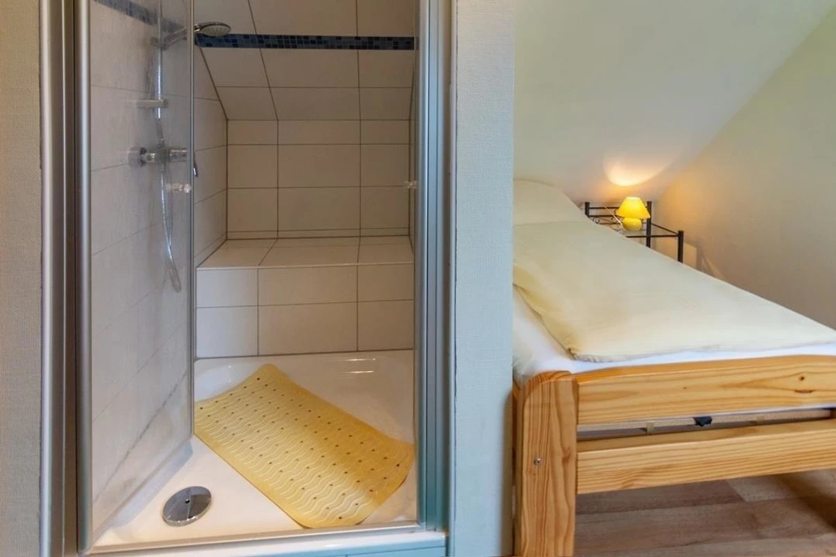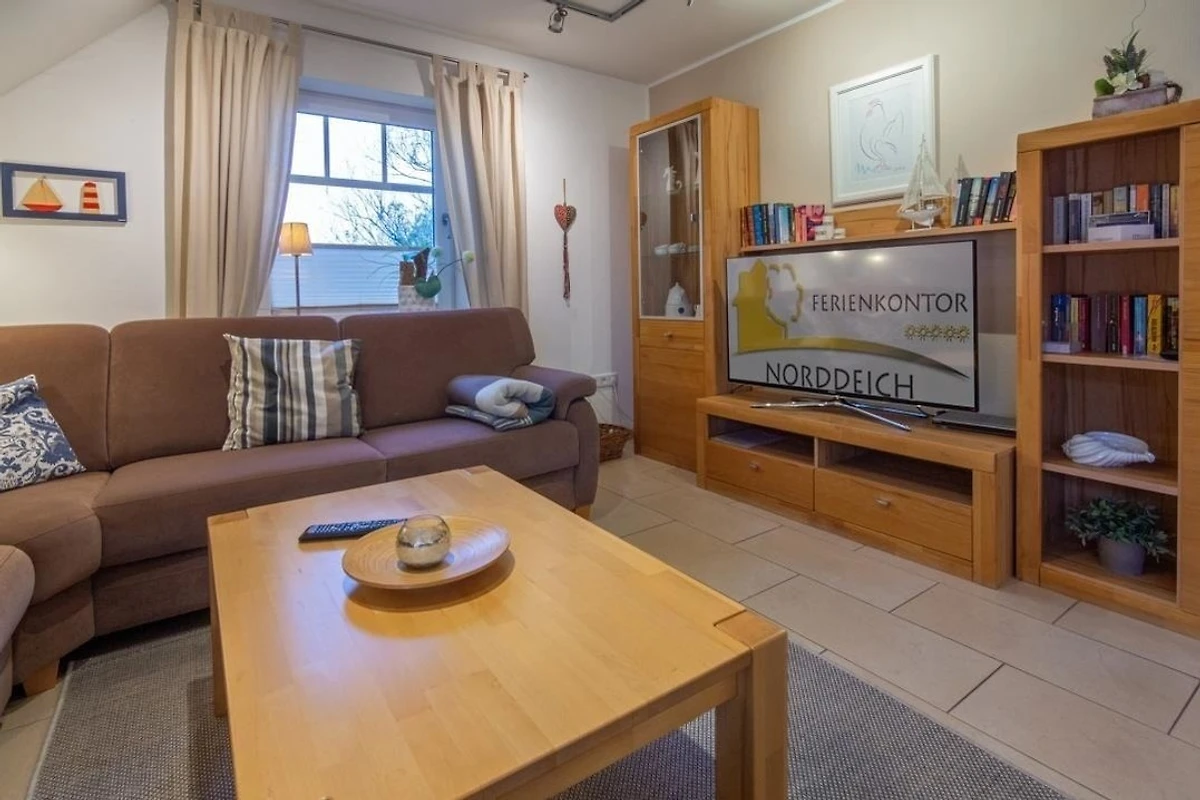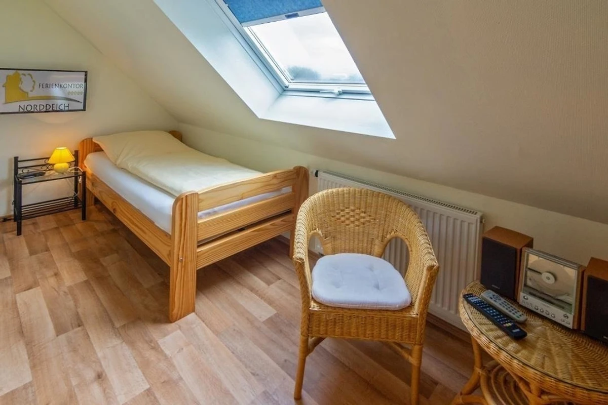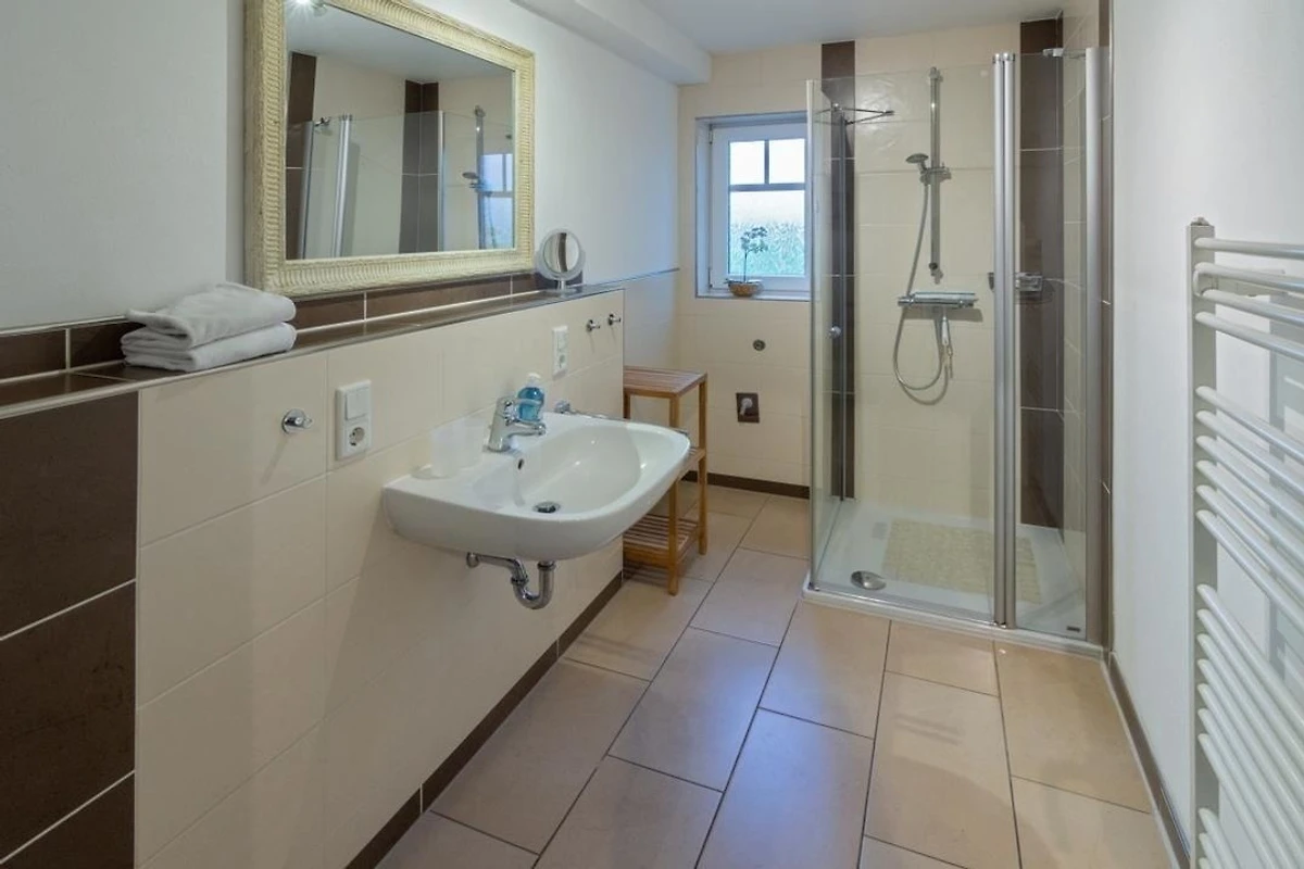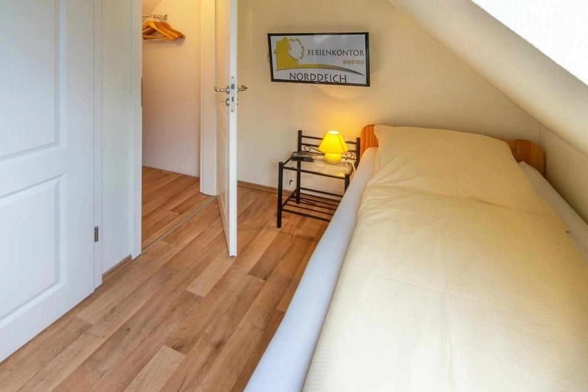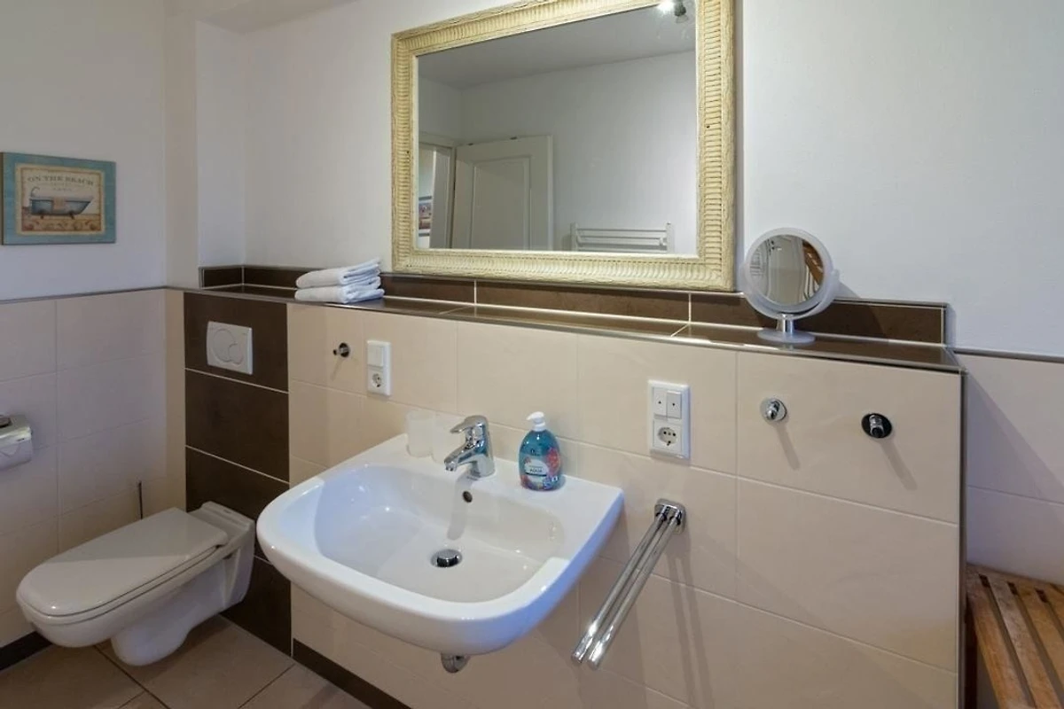 Das Badezimmer bietet eine Dusche, ein WC, einen Haartrockner, ein Waschbecken, einen Kosmetikspiegel und einen Spiegel. Es gibt ein Fenster und warmes Wasser. Im Aussenbereich gibt es Gartenmöbel auf dem Balkon, Sonnenliegen und einen Windschutz. Diese umfangreiche Ausstattung sorgt für einen komfortablen und entspannten Aufenthalt in Norddeich.