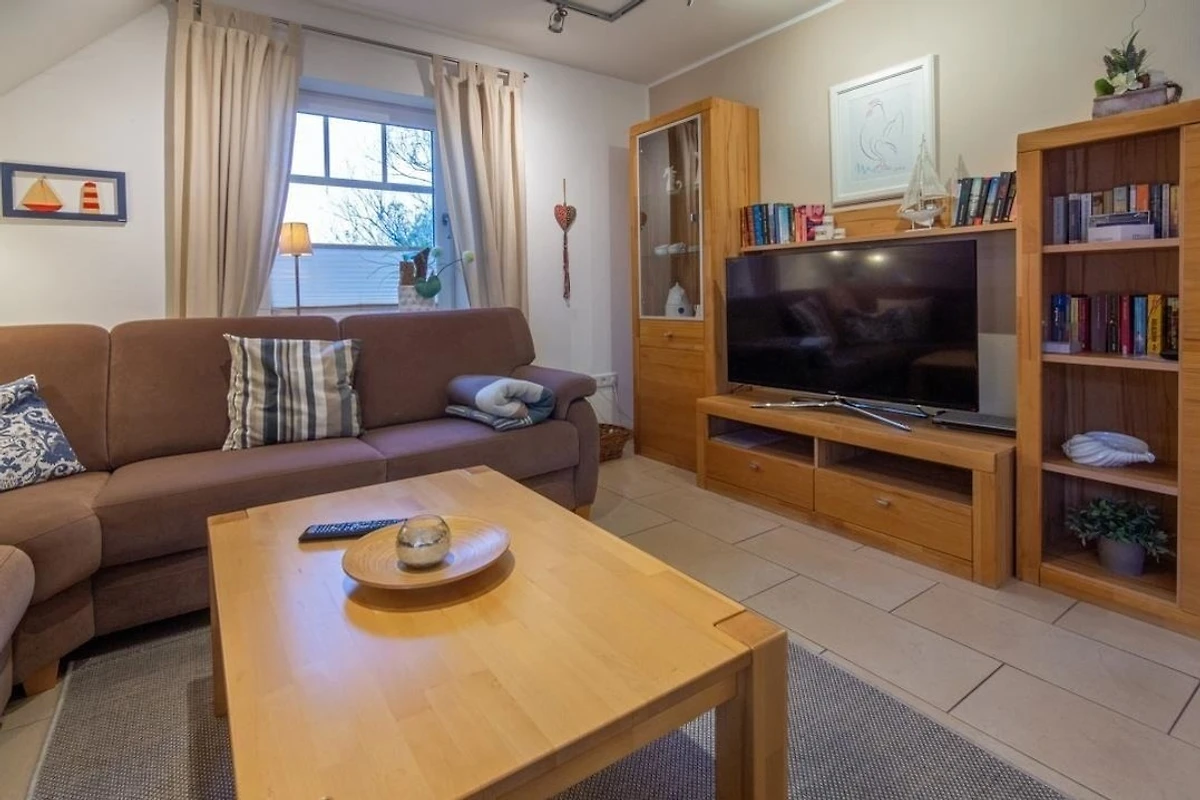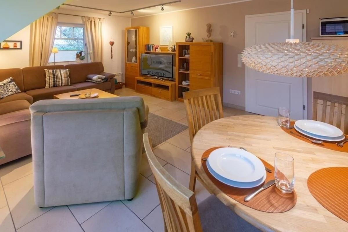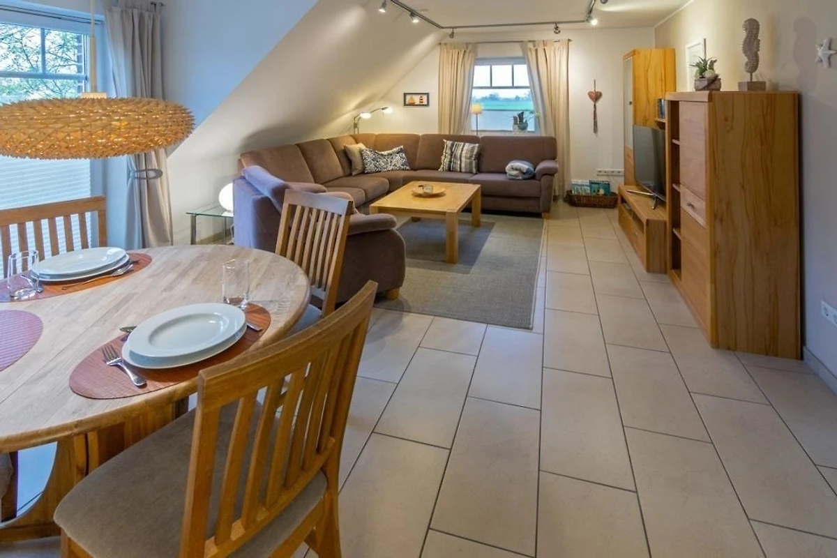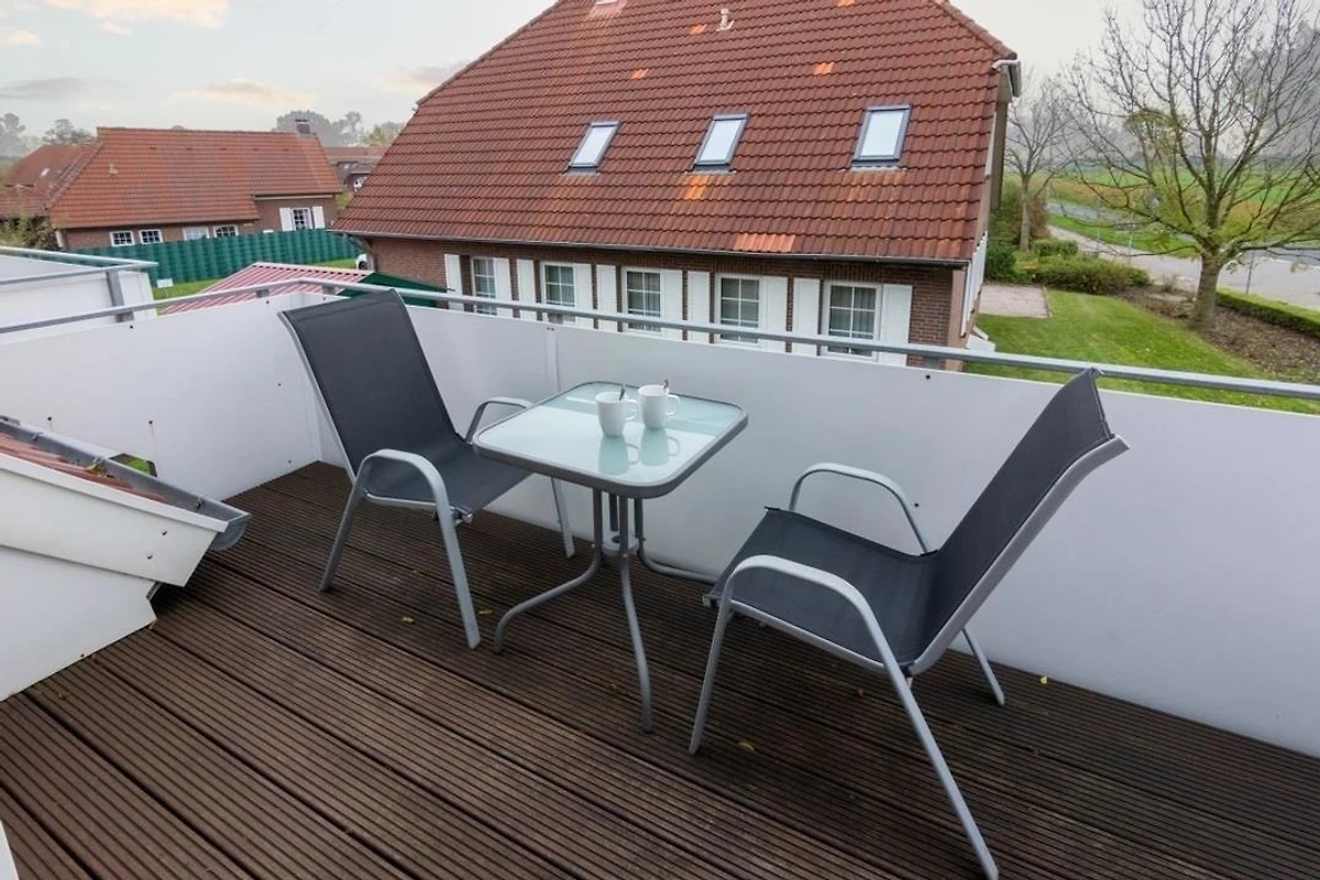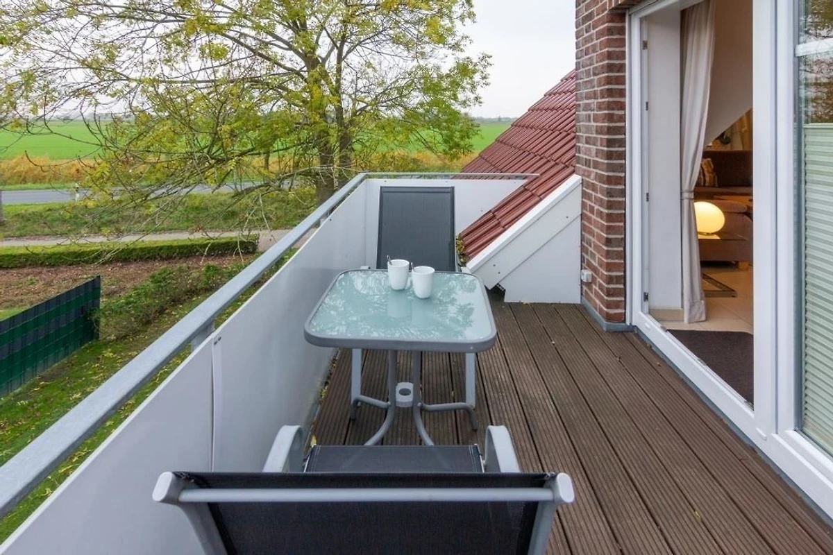Ein Highlight der Wohnung ist der Balkon mit Gartenmöbeln, der einen schönen Blick auf den Deich bietet. Kostenloses WLAN und ein privater Parkplatz sind ebenfalls vorhanden. Die Sauna kann gegen eine Gebühr von 2 € pro 20 Minuten genutzt werden.