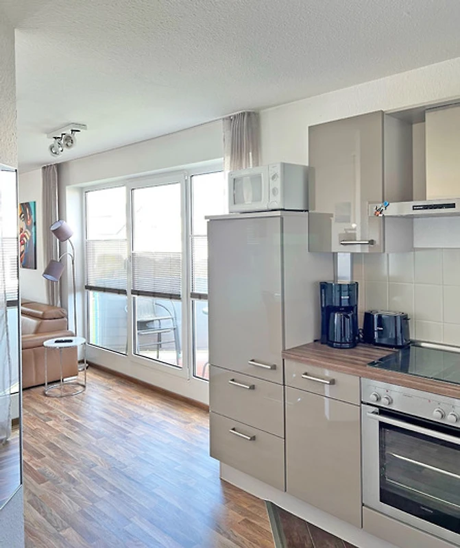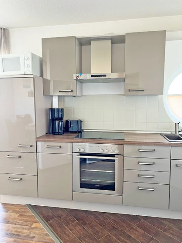 Die offene und moderne Küche ist mit allen wichtigen Utensilien ausgestattet. Im Flur können Sie Ihre Garderobe ablegen und Ihre Schuhe in den Seitenschrank abstellen.