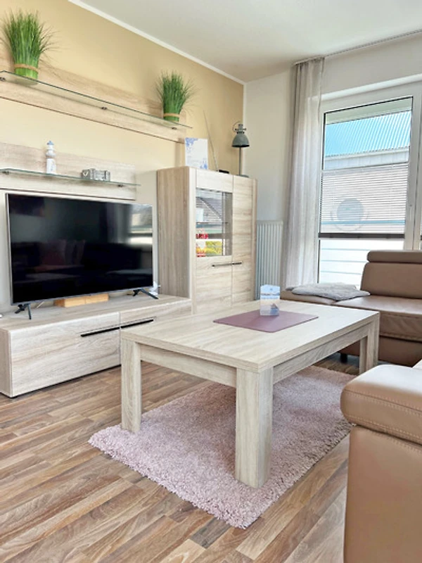 Es erwartet Sie ein helles Wohnzimmer mit einem grossen und bequemen Ledersofa, einem Couchtisch und einem grossen Fernseher sowie Schränke, einige Gesellschaftsspiele und Bücher stehen Ihnen zur Verfügung. Das grosse Fenster verfügt über eine Aussenjalousie; Innenjalousien machen den Wohnraum gemütlich. Ein kleiner Balkon, ausreichend für 2 Personen, steht Ihnen zur Verfügung. Angrenzend an das Wohnzimmer befindet sich ein separater Essbereich.