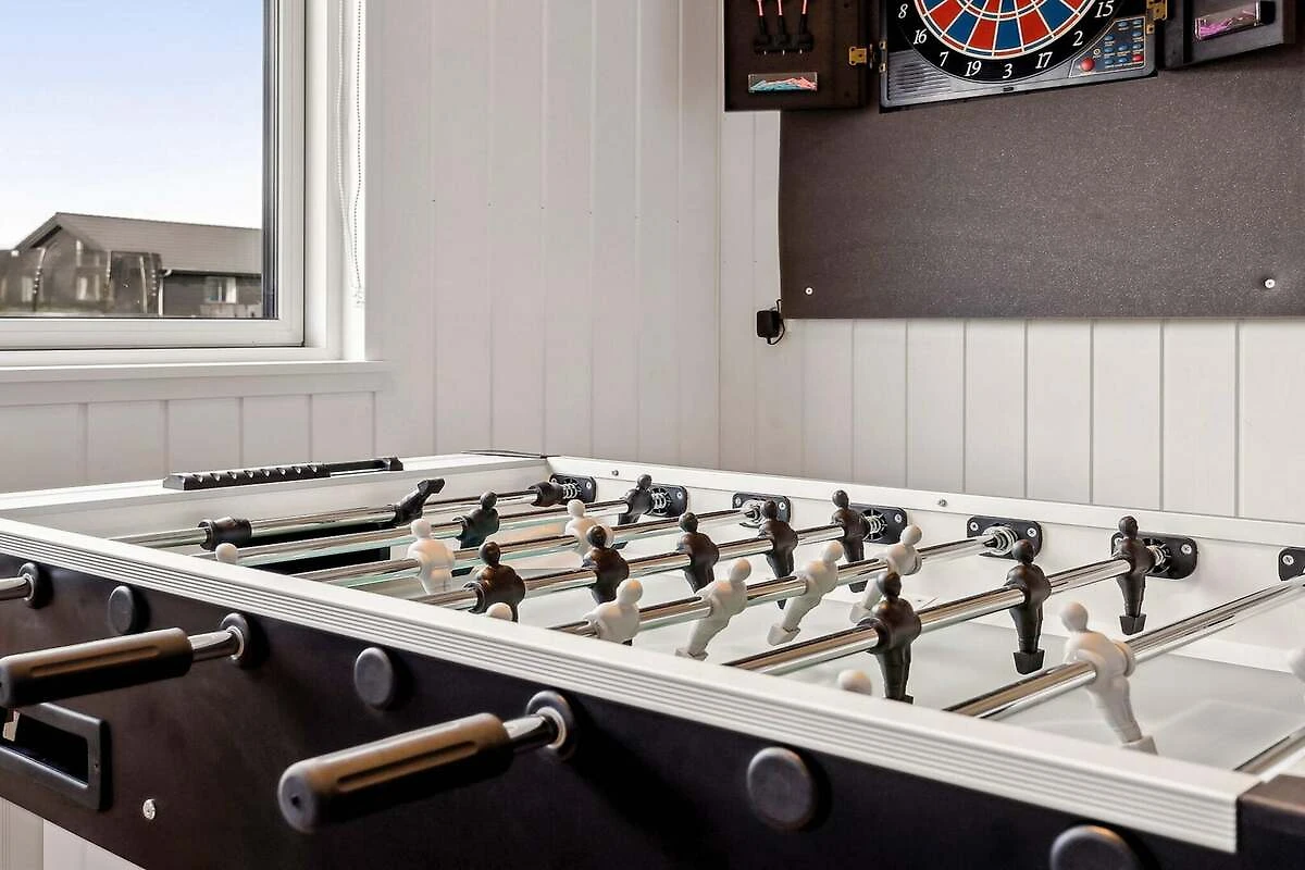 , Wohnzimmer(TV(Deutsch Fernsehsender, dänische Fernsehsender, norwegische Fernsehsender, schwedische Fernsehsender)), Wohnzimmer(Trockner, Waschmaschine), Wohnzimmer(4x Einzelbett), Küche(Kochherd(elektrisch), Kaffeemaschine, Mikrowelle, Spülmaschine, Kühl-/Gefrierkombination, Hochstuhl), Wohn-/Schlafzimmer(TV(Deutsch Fernsehsender, dänische Fernsehsender, norwegische Fernsehsender, schwedische Fernsehsender)), Schlafzimmer(Doppelbett), Schlafzimmer(Doppelbett), Schlafzimmer(2x Einzelbett), Schlafzimmer(2x Einzelbett), Schlafzimmer(2x Einzelbett), Schlafzimmer(2x Einzelbett), Schlafzimmer(2x Einzelbett, Babybett), Badezimmer(Waschbecken, Dusche, Toilette), Badezimmer(Waschbecken, Dusche, Toilette), Badezimmer(Waschbecken, Dusche, Toilette), outdoor shower(im Garten), TV(Deutsch Fernsehsender, dänische Fernsehsender, norwegische Fernsehsender, schwedische Fernsehsender), Spielkonsole, Kühlschrank(+ Gefrierfach), Whirlwanne(im Garten, erwärmt, 5 Personen), Sauna(im Garten, 5 Personen), Heizung(elektrisch), Terrasse, Gartenmöbel, Pool(im Innenbereich), Spielgeräte, Tischtennisplatte, Tischfußball, Dart, Billard