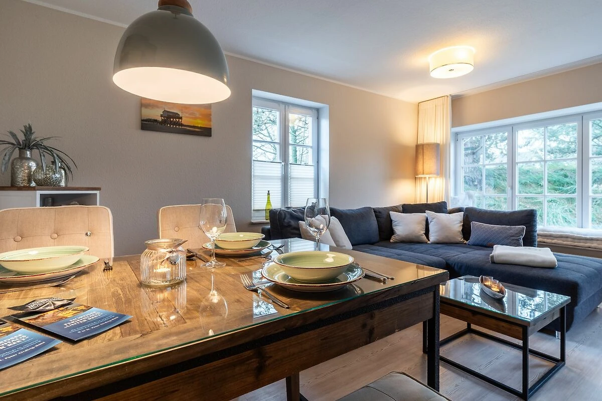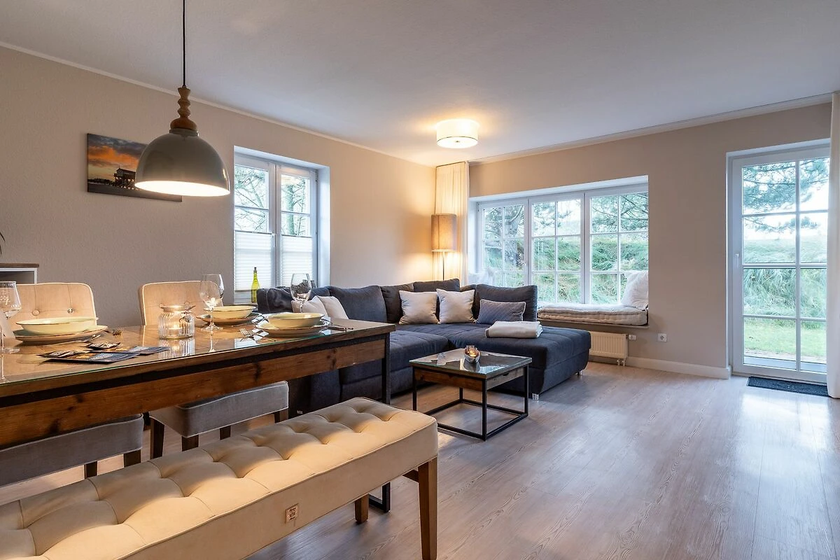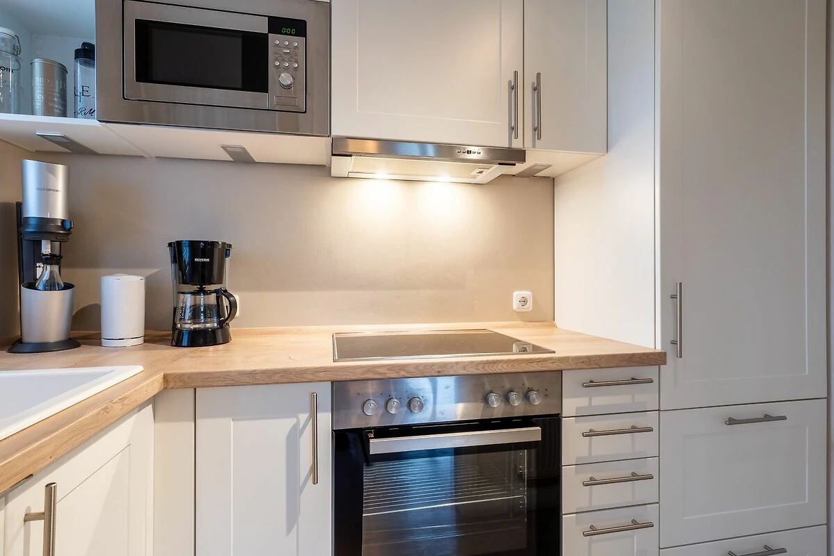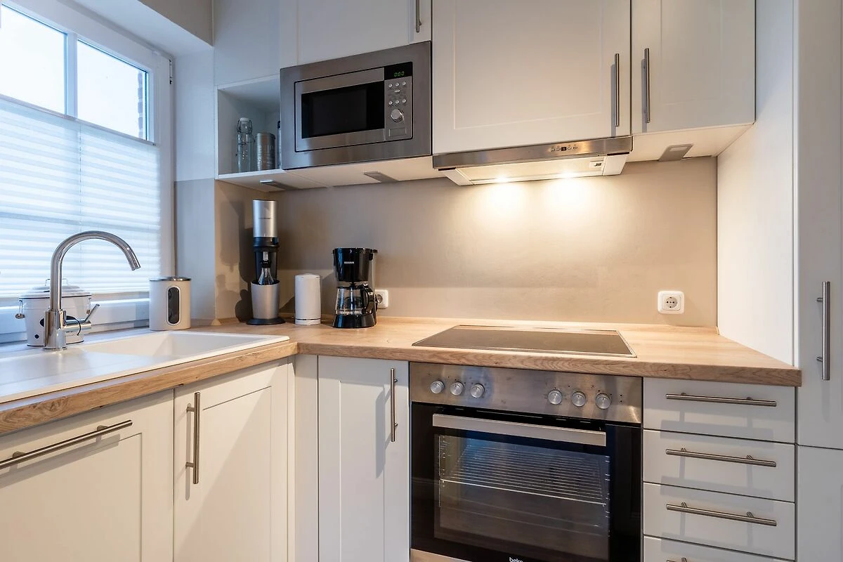 Die Ferienwohnung besticht durch helle, maritime Materialien und einen offenen Wohn- und Essbereich, der direkt auf die sonnige Südterrasse führt. Hier erwartet Sie ein Strandkorb und ein kleiner Gartenanteil – perfekt, um die frische Nordseeluft zu genießen. Die angrenzende, moderne Küche ist komplett ausgestattet, unter anderem mit einem 4-Platten-Cerankochfeld, Backofen, Mikrowelle und Geschirrspüler, sodass Sie auch kulinarisch verwöhnt werden.