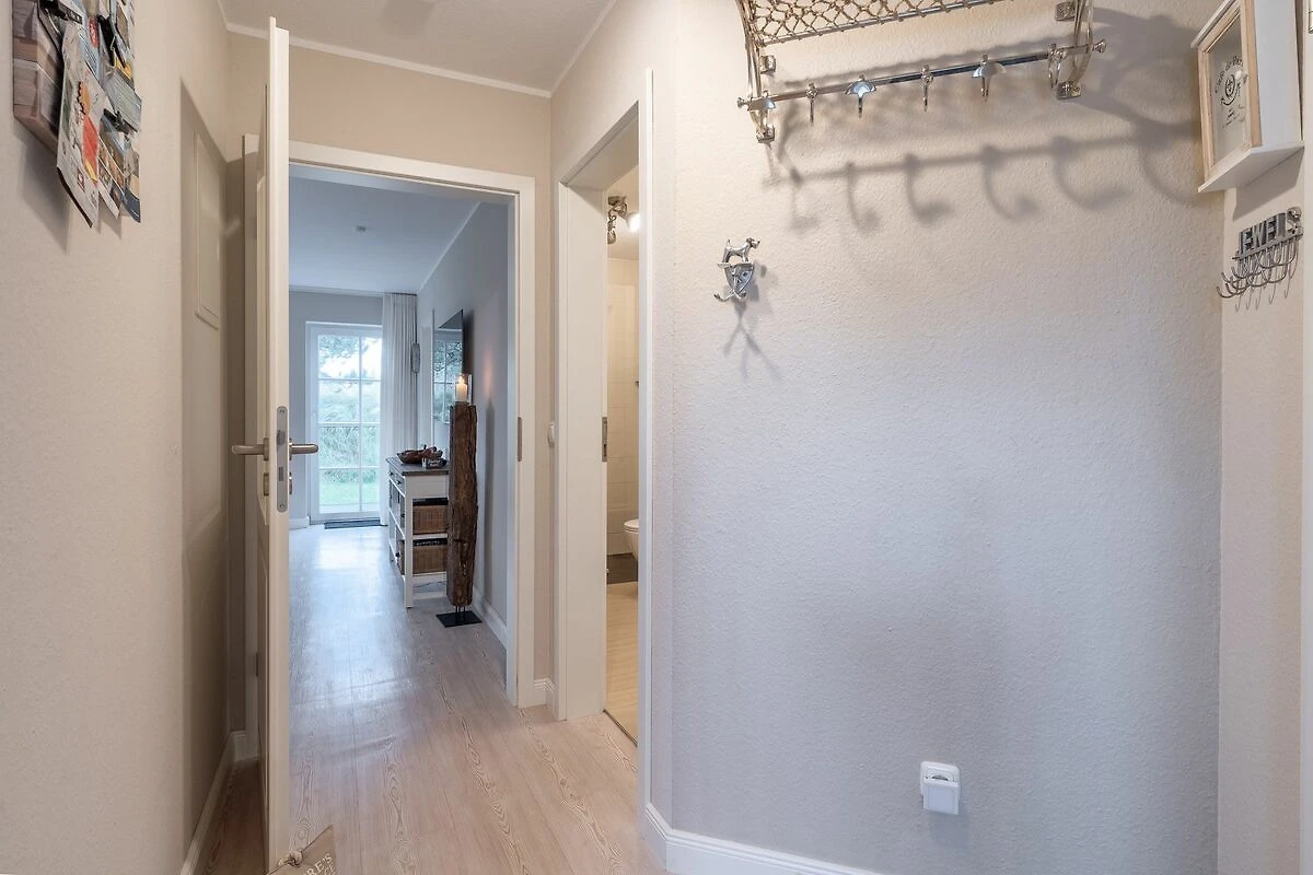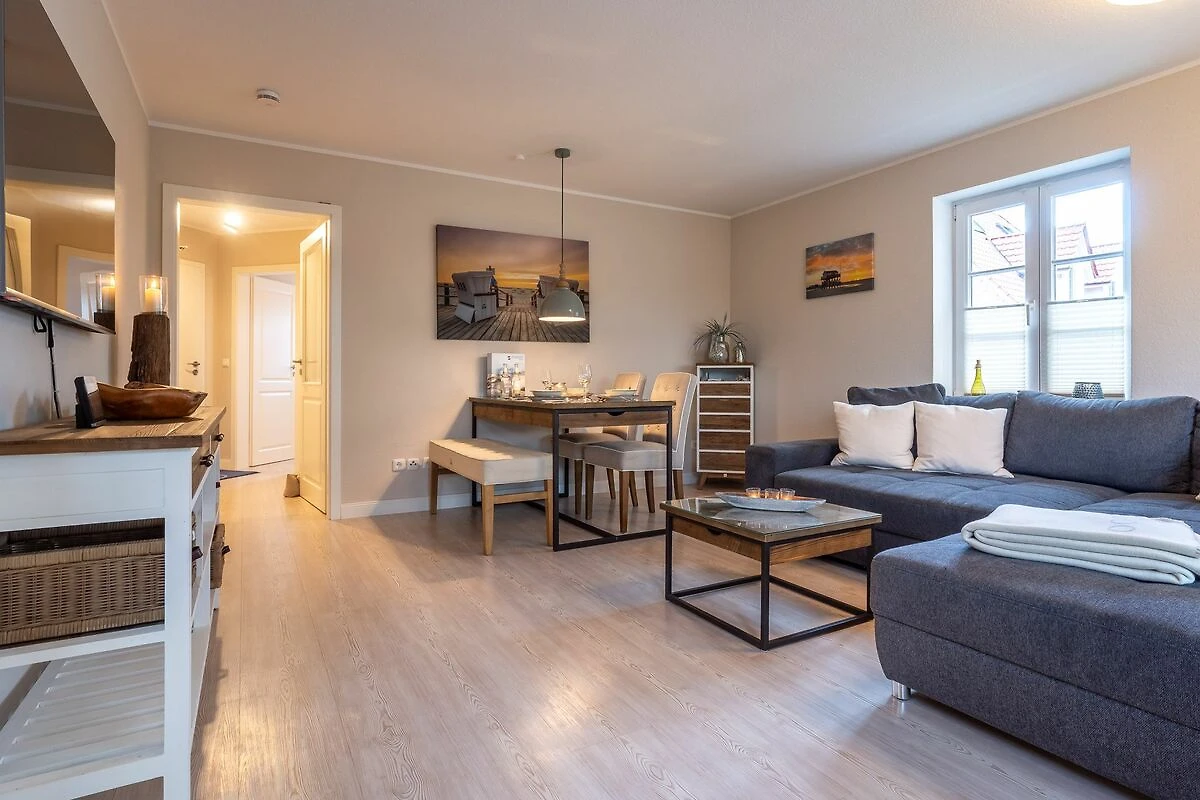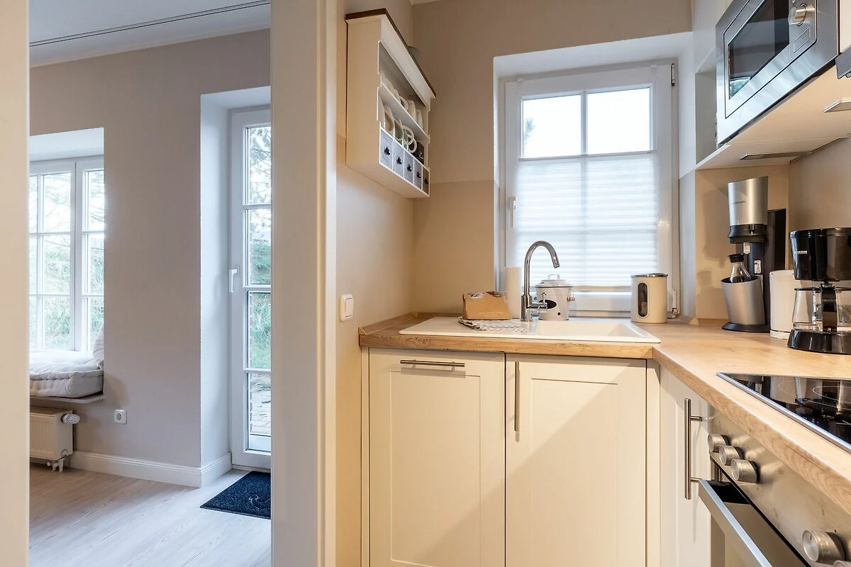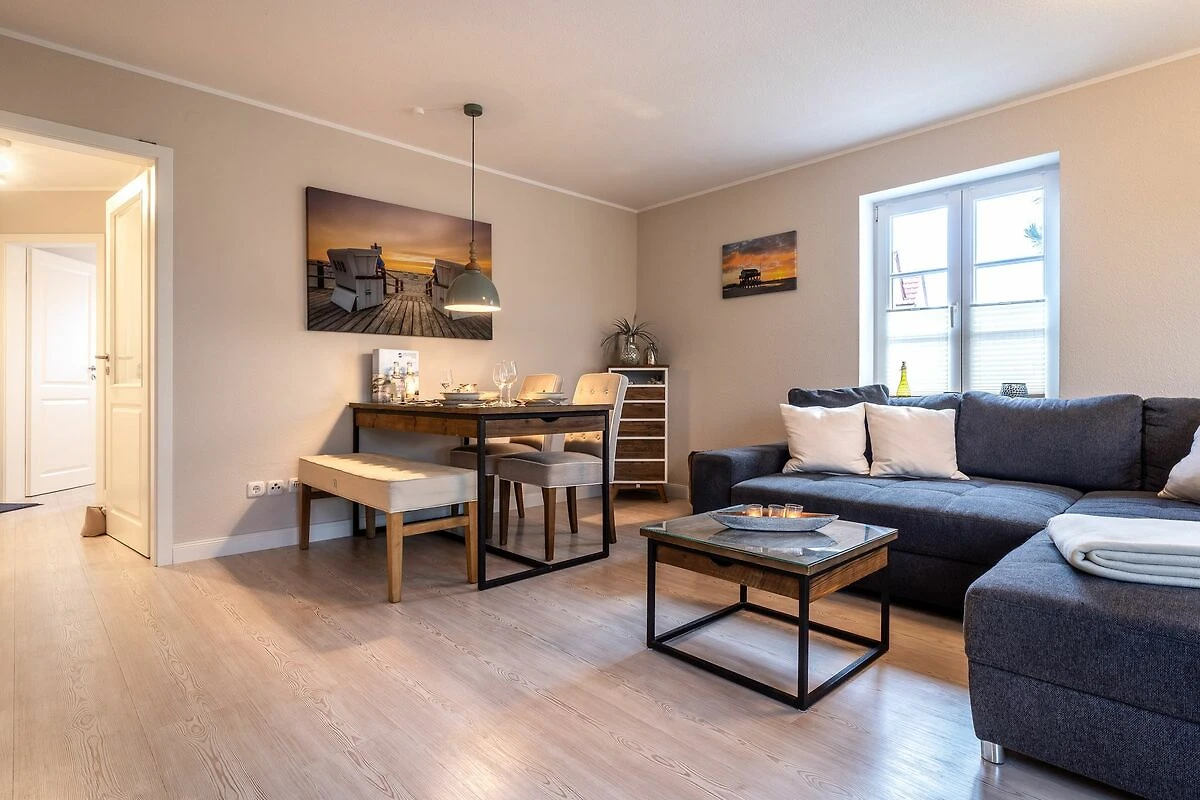 Die Ferienwohnung besticht durch helle, maritime Materialien und einen offenen Wohn- und Essbereich, der direkt auf die sonnige Südterrasse führt. Hier erwartet Sie ein Strandkorb und ein kleiner Gartenanteil – perfekt, um die frische Nordseeluft zu genießen. Die angrenzende, moderne Küche ist komplett ausgestattet, unter anderem mit einem 4-Platten-Cerankochfeld, Backofen, Mikrowelle und Geschirrspüler, sodass Sie auch kulinarisch verwöhnt werden.