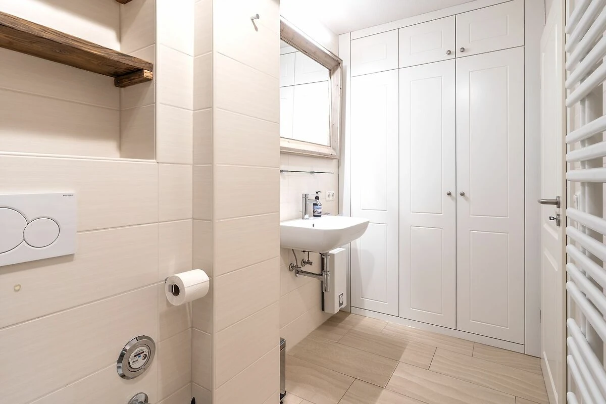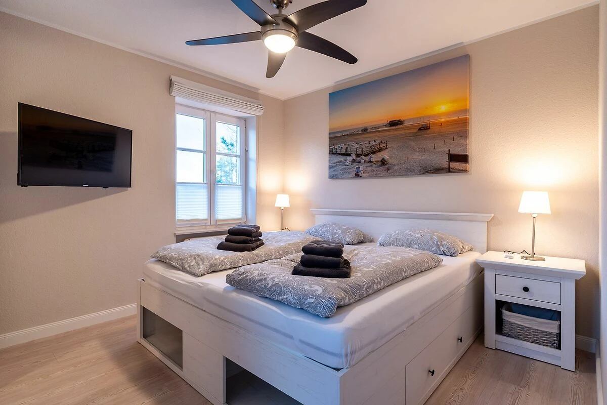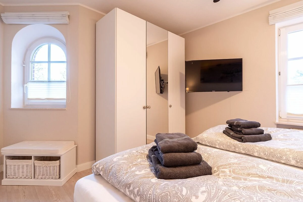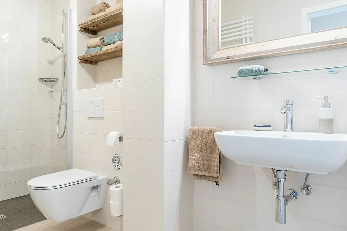 Im separaten Schlafzimmer mit einem komfortablen Doppelbett (2 x 90 x 200 cm) finden Sie Ruhe und Erholung. Das moderne Duschbad verfügt über eine bodengleiche Dusche und ist ebenfalls hochwertig ausgestattet. WLAN ist vorhanden, ebenso ein TV im Wohnzimmer und ein weiterer im Schlafzimmer.