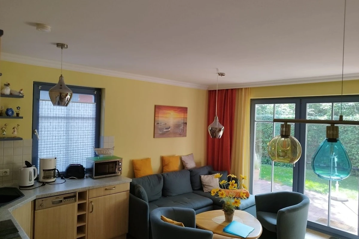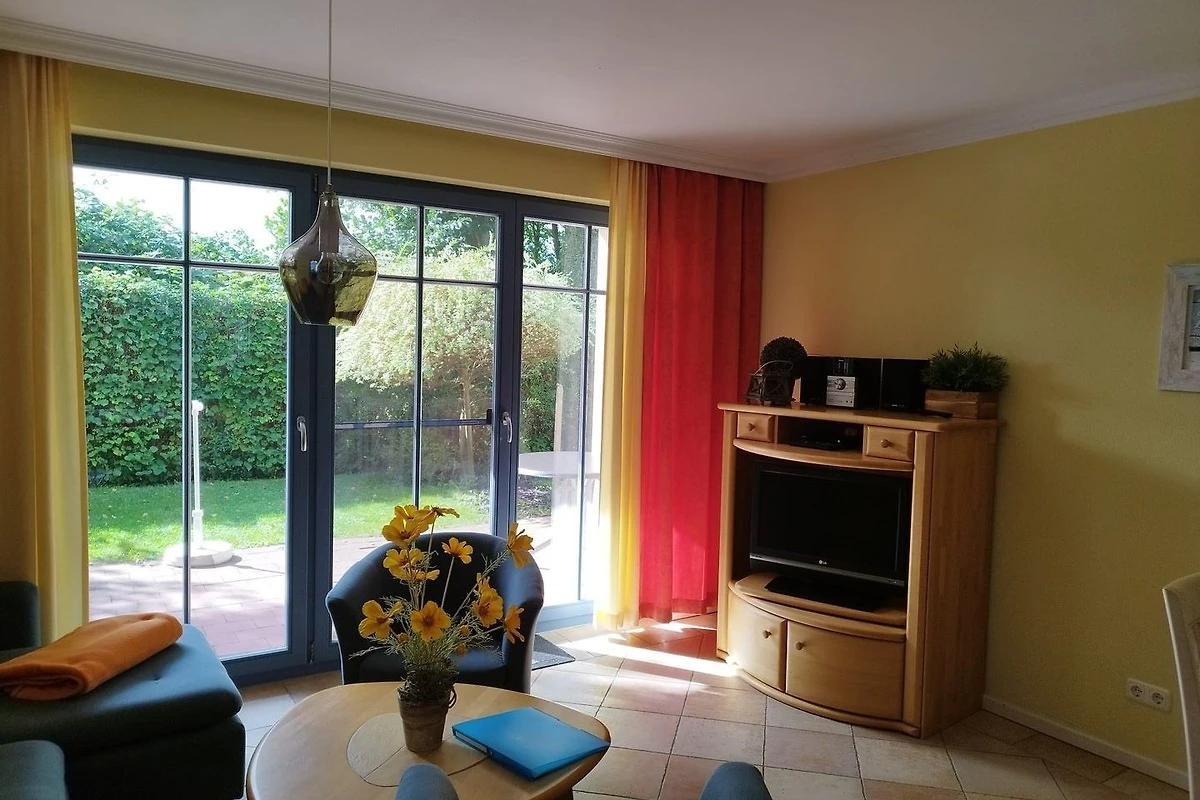 Im Wohnzimmer gibt es einen Flachbildschirm-TV sowie ein Radio mit CD. Eine einfache Spielesammlung und Bücher sind vorhanden.