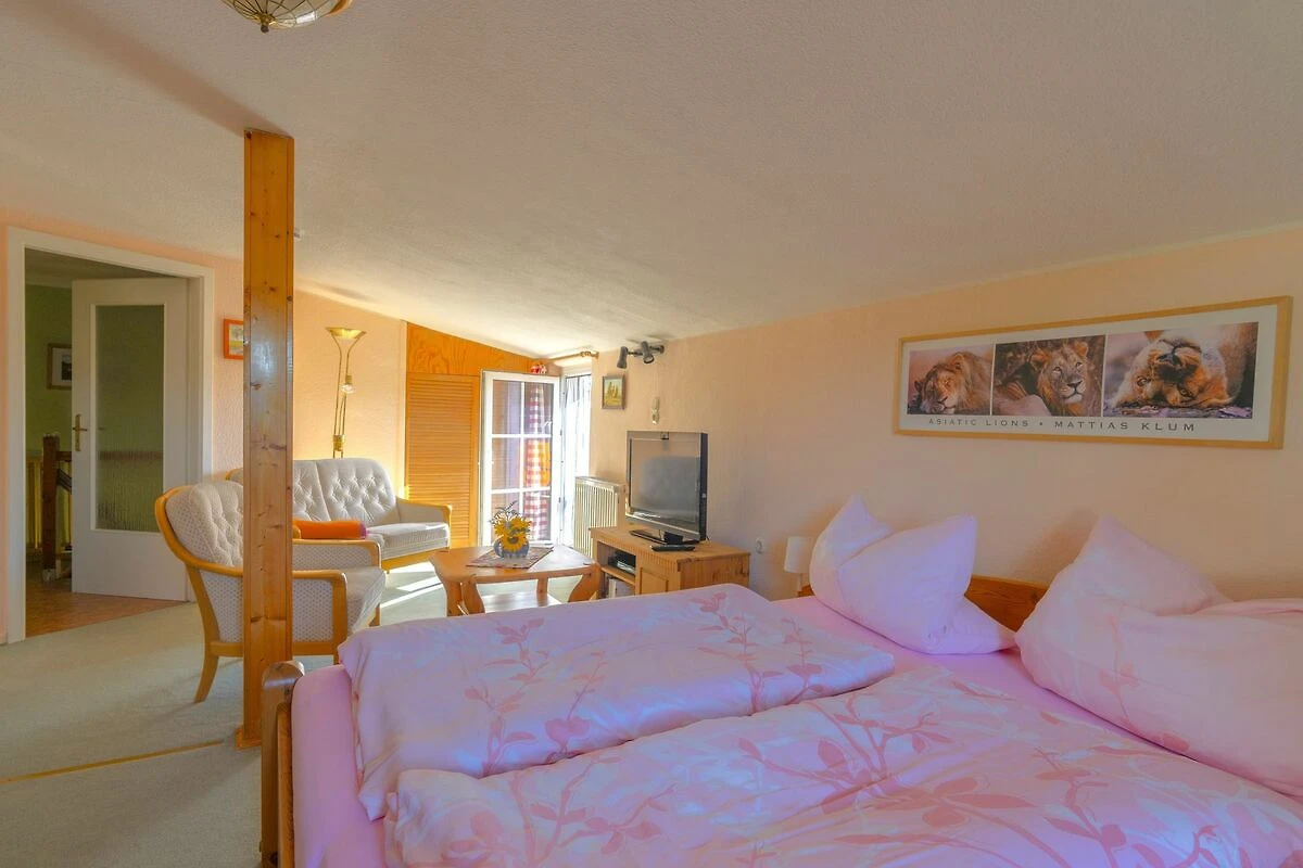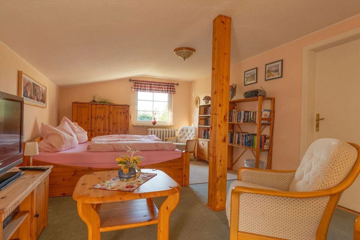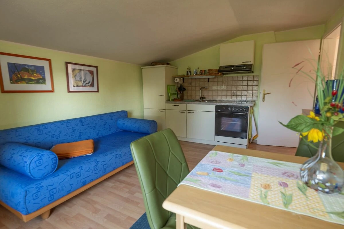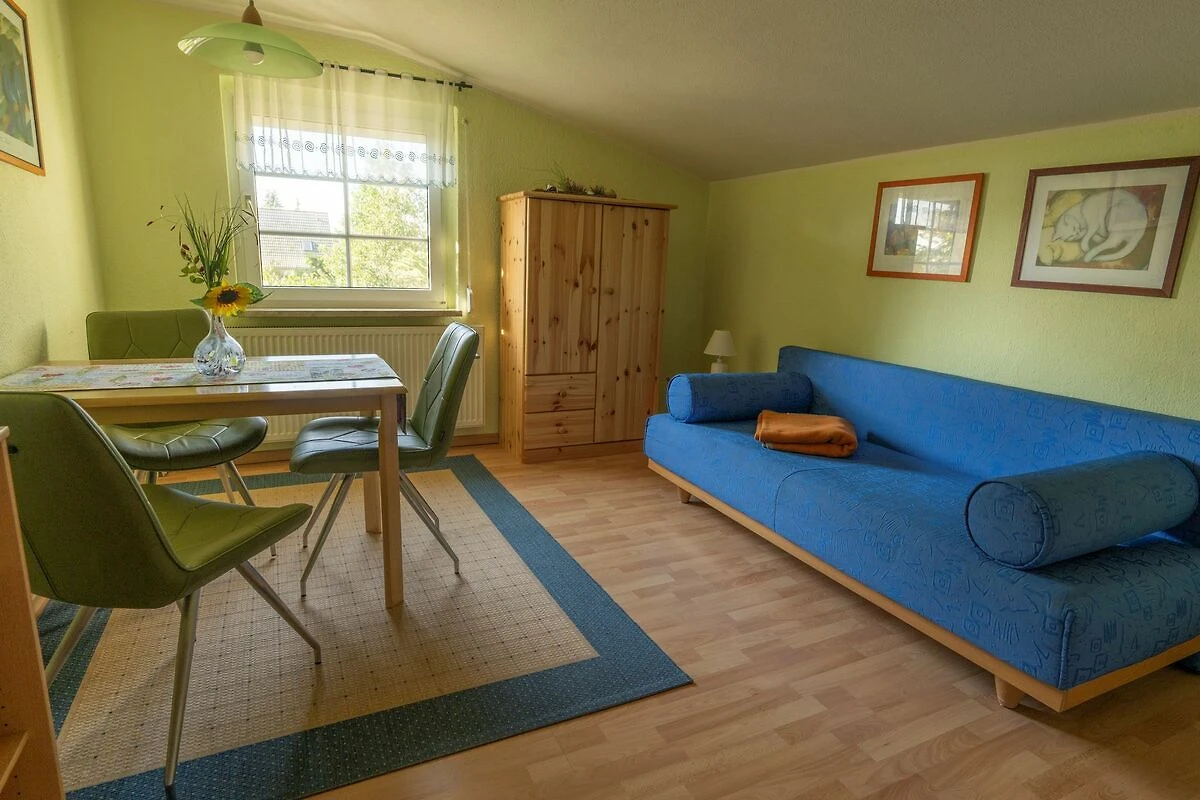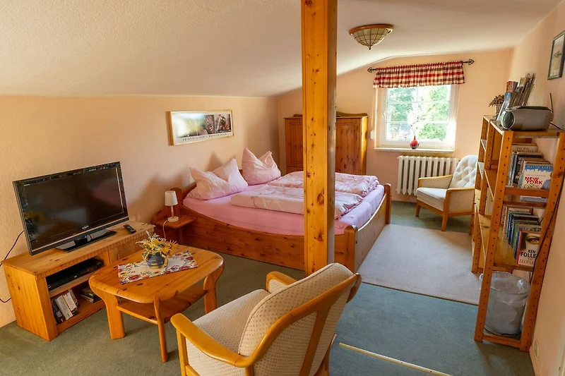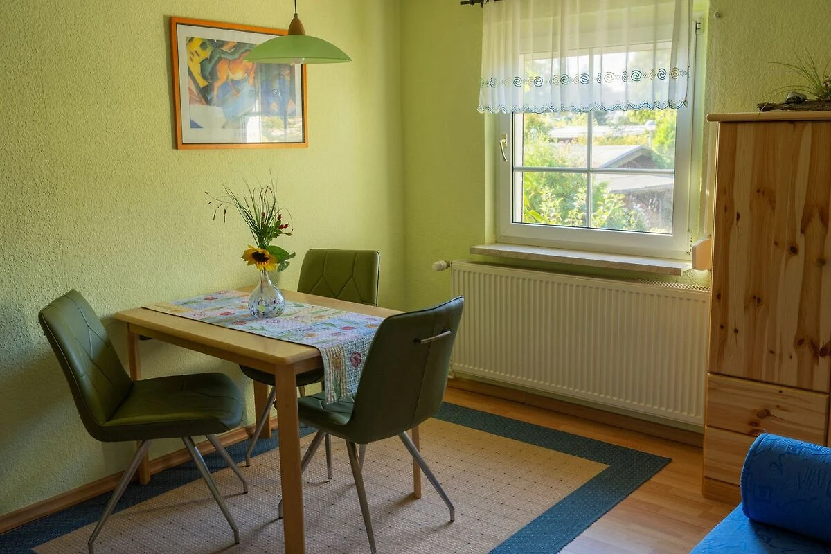 Die ca. 55qm grosse2-Raum-Ferienwohnung befindet sich im 1.OG des Wohnhauses der Vermieter und verfügt über einen grossen Balkon. Das kombinierte Wohn-Schlafzimmer ist mit einem Doppelbett, Kleiderschrank, Sitzmöbeln, Flat-TV, Video- und DVD-Player ausgestattet. Im zweiten Zimmer, der Wohnküche, befindet sich eine ausklappbare Schlafcouch (Liegefläche ca. 1,40 x 2,00 m), die voll ausgestattete Küche mit Herd (4Ceranplatten) und Backofen, Kaffeemaschine, Toaster, Spüle, Kühlschrank mit Gefrierfach und Esstisch mit Stühlen sowie ein Radio mit CD-Player. Das Tageslichtbad verfügt über Dusche/WC und Haarfön. WLAN steht Ihnen kostenfrei zur Verfügung. Zur Unterkunft gehört eine Sitzecke im Garten mit Liegewiese wo Grillen und Lagerfeuer möglich sind. Die Erstausstattung Bettwäsche und Handtücher, Kinderbett & Hochstuhl sowie die Nutzung von 2 Fahrrädern und 1 Doppelkajak sind kostenfrei inkludiert. Ein PKW-Stellplatz und die Strom und Wasserkosten sind ebenfalls inklusive.