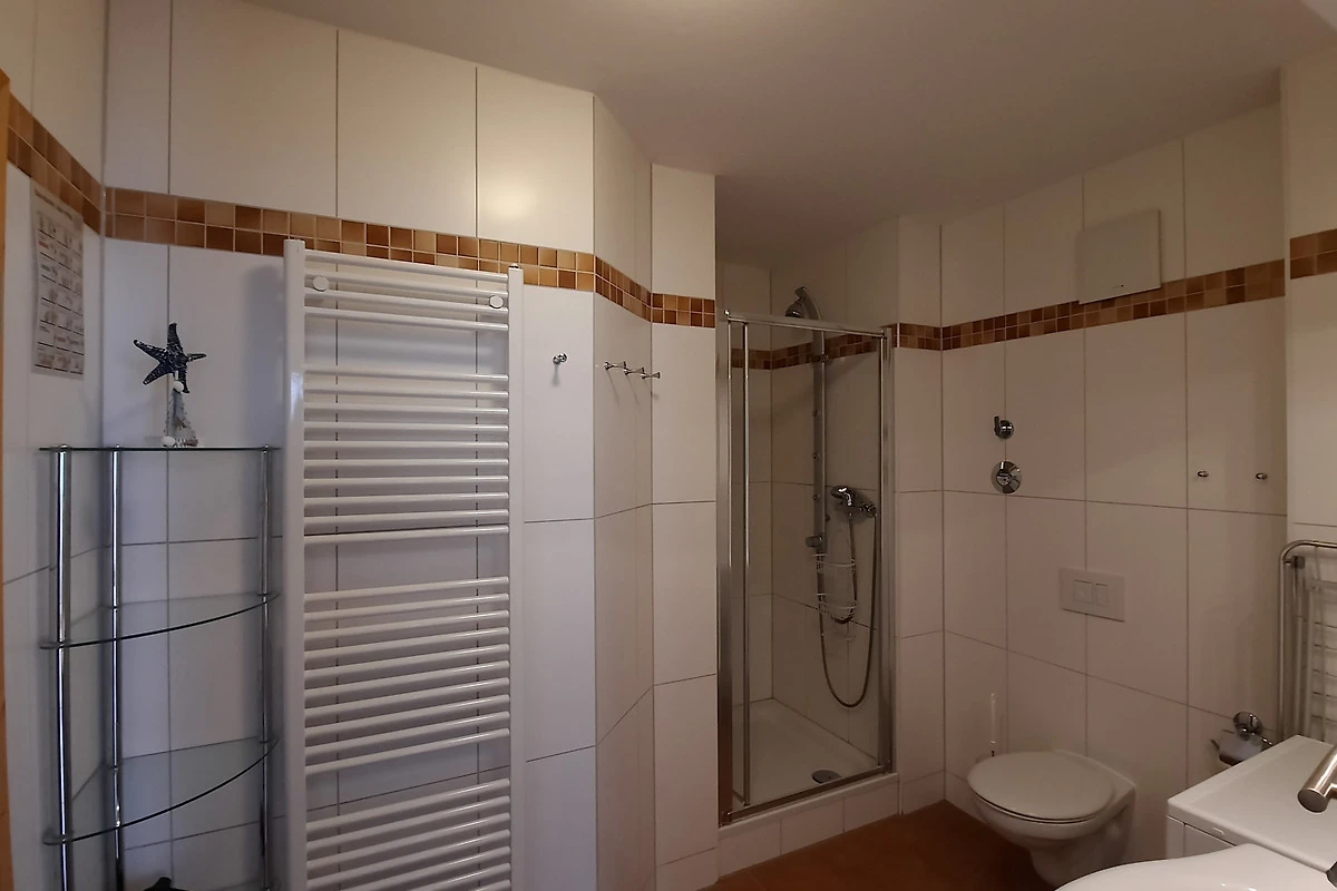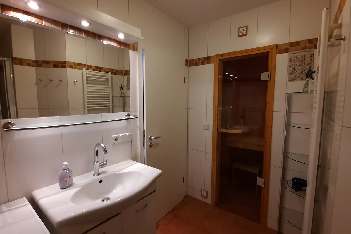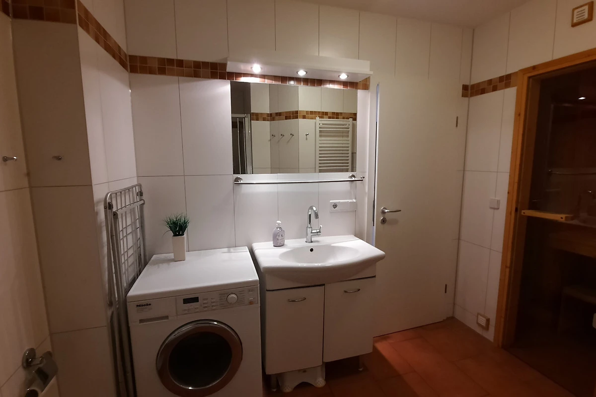 Im hochwertig eingerichteten Badezimmer finden Sie neben der Wellnessdusche und eigener Sauna, auch einen Miele-Waschtrockner sowie einen Föhn.