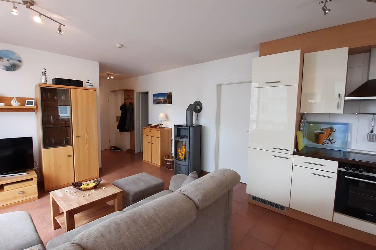 Die gemütliche Sitzgruppe lädt mit 40 Zoll Smart-TV und Yamaha-Soundsystem mit iPod-Dock zu geselligen Abenden mit der ganzen Familie ein. Auf dem nach Süden ausgerichteten, möblierten Balkon mit Meerblick können Sie die Sonne geniessen. In der kälteren Jahreszeit sorgen der Kamin und die Fussbodenheizung für wohlige Wärme.