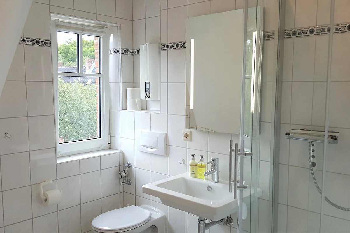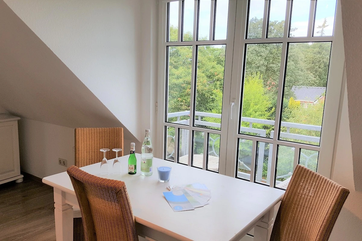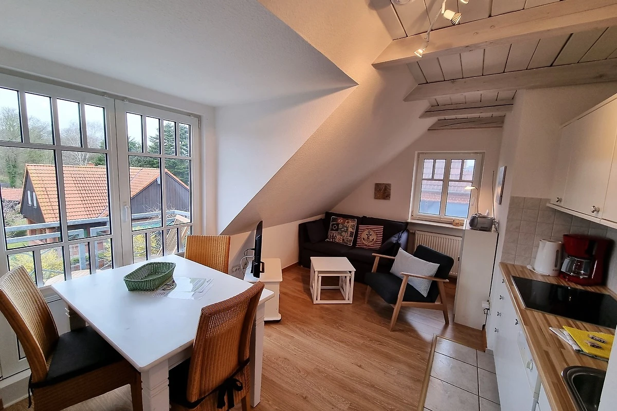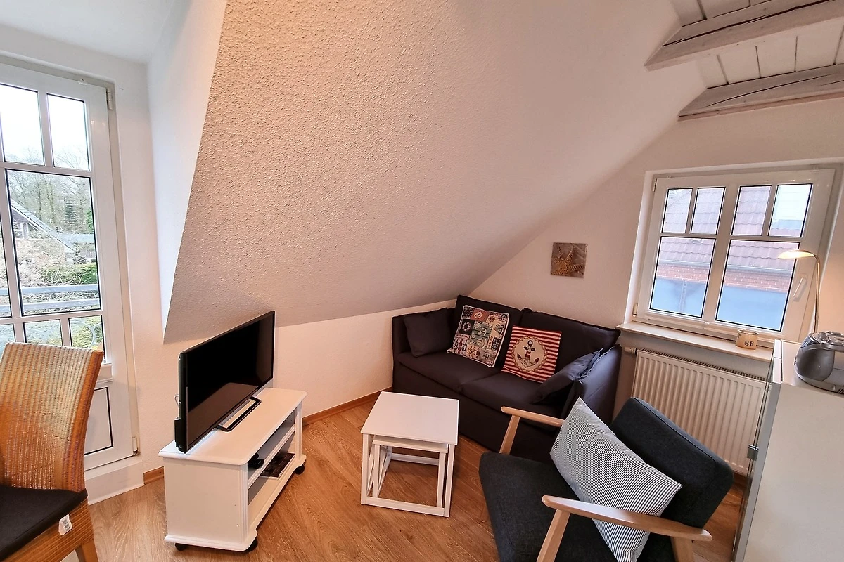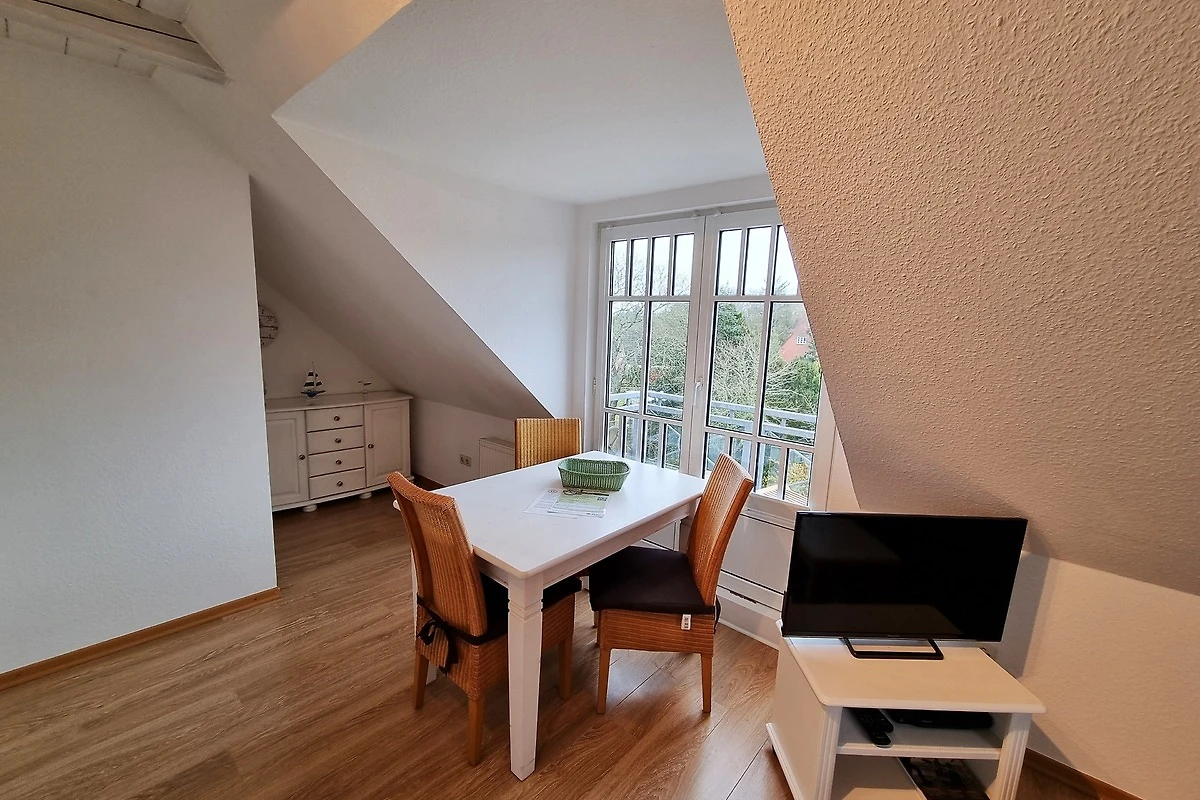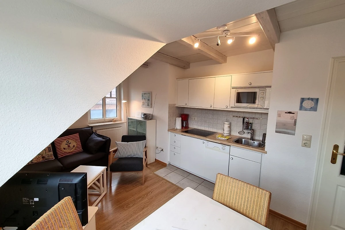Willkommen in dieser gemütlichen Dachgeschosswohnung in Wyk auf Föhr, ideal für Ihren Strandurlaub! Die 45 m² grosse Ferienwohnung mit 2 Zimmern befindet sich zusammen mit fünf weiteren Wohneinheiten in der Nähe des Südstrandes. Die Wohnung lädt zum Wohlfühlen ein und verfügt über ein kombiniertes Wohn- und Esszimmer mit einer kleinen, aber gut ausgestatteten Küchenzeile. Hier finden Sie alles, was Sie zum Kochen benötigen, einschliesslich Geschirrspüler, Mikrowelle und Kühlschrank mit Gefrierfach. Der Esstisch mit Platz für drei Personen bietet einen herrlichen Blick auf den kleinen englischen Balkon zur Westseite, während die gemütliche Wohnzimmerecke mit Flachbild-TV zum Entspannen einlädt.