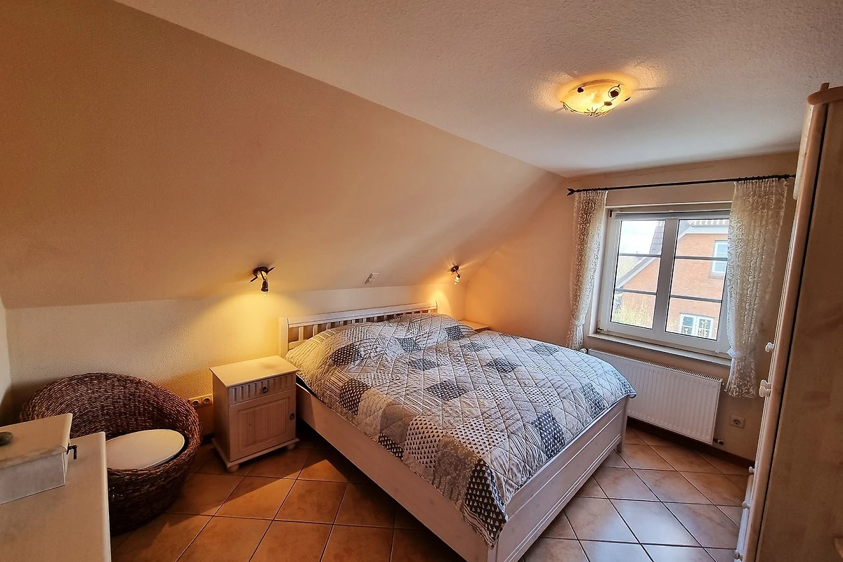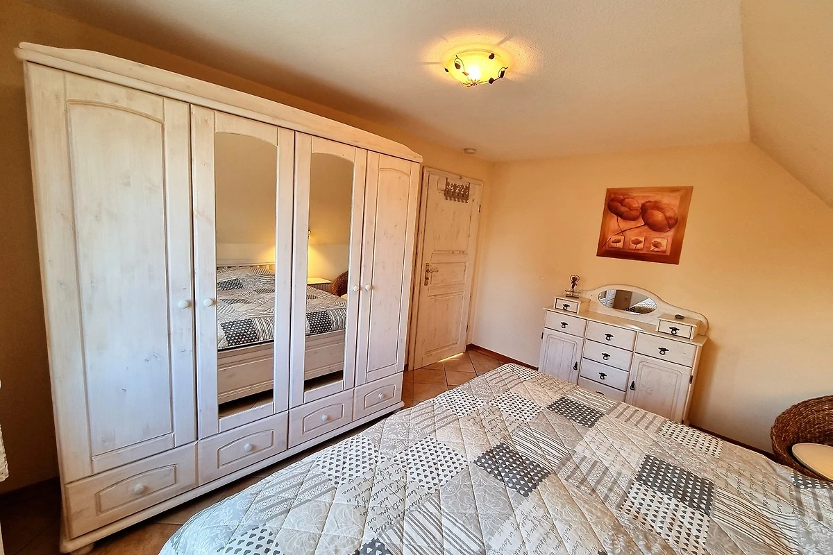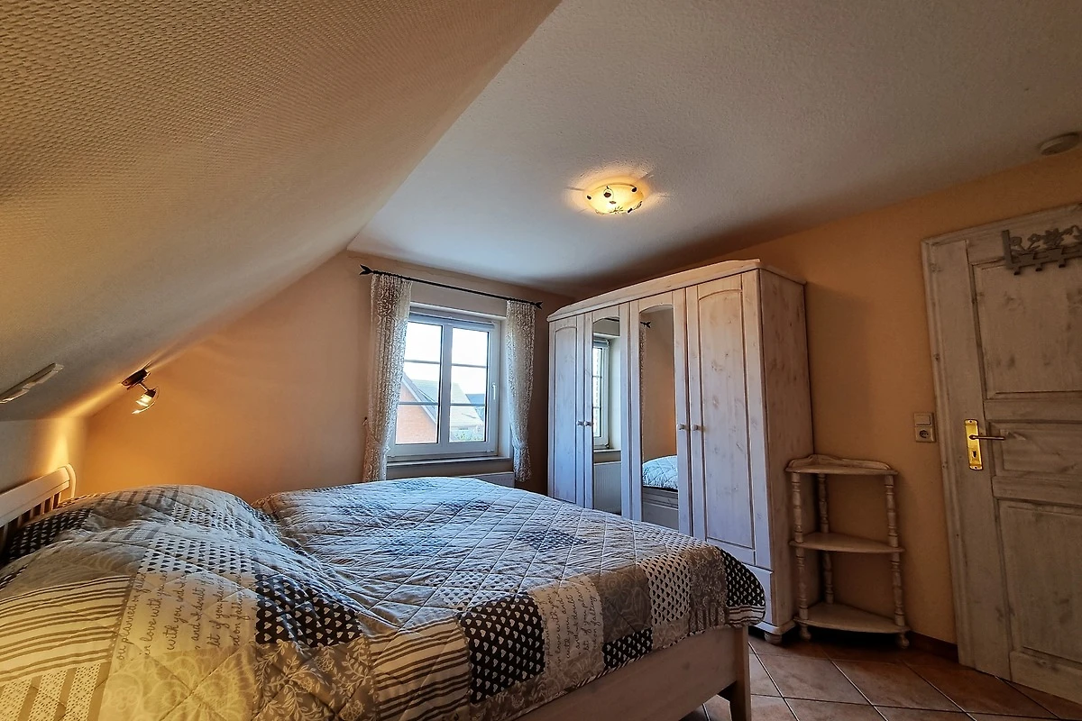 Ein Schlafzimmer ist mit einem Doppelbett (1,80 × 2,00 m) sowie einem Kleiderschrank ausgestattet.