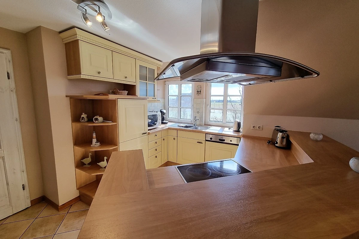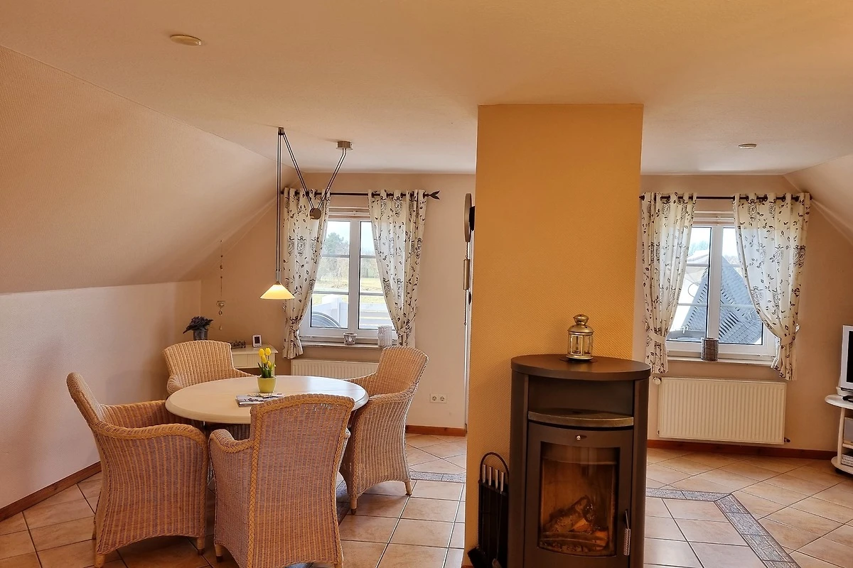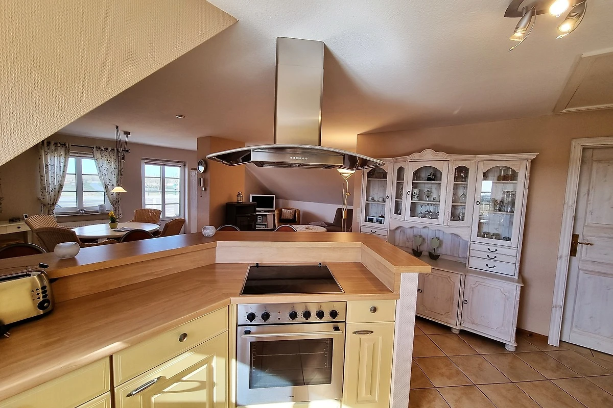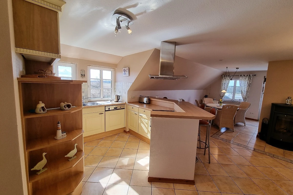Diese gemütliche 75 qm grosse familienfreundliche Ferienwohnung im ersten Obergeschoss am Ortsrand von Oevenum freut sich auf ihren Besuch. Die offene Landhausküche mit Theke ist sehr gut ausgestattet und der grosszügige Wohn- Essbereich mit Kamin lädt zum Verweilen ein. Ein Schlafzimmer verfügt über ein Doppelbett 1,80x2,00 m und einem Kleiderschrank. Das zweite Schlafzimmer verfügt über zwei Einzelbetten 0,90x2,00 m und einem Kleiderschrank. Ein Kinderbett kann problemlos in den Schlafzimmern aufgebaut werden. Im geräumigen Bad haben sie die Wahl zwischen einer Badewanne oder der Dusche. Ein Föhn ist ebenfalls vorhanden. Auf dem Balkon im Strandkorb relaxen mit Blick auf die Wiesen und Felder ist hier ein Traum. Waschmaschine, Trockner, Kinderbett und Hochstuhl sind kostenlos nutzbar. Ein abschliessbarer Fahrradschuppen und ein Parkplatz sind direkt am Haus.