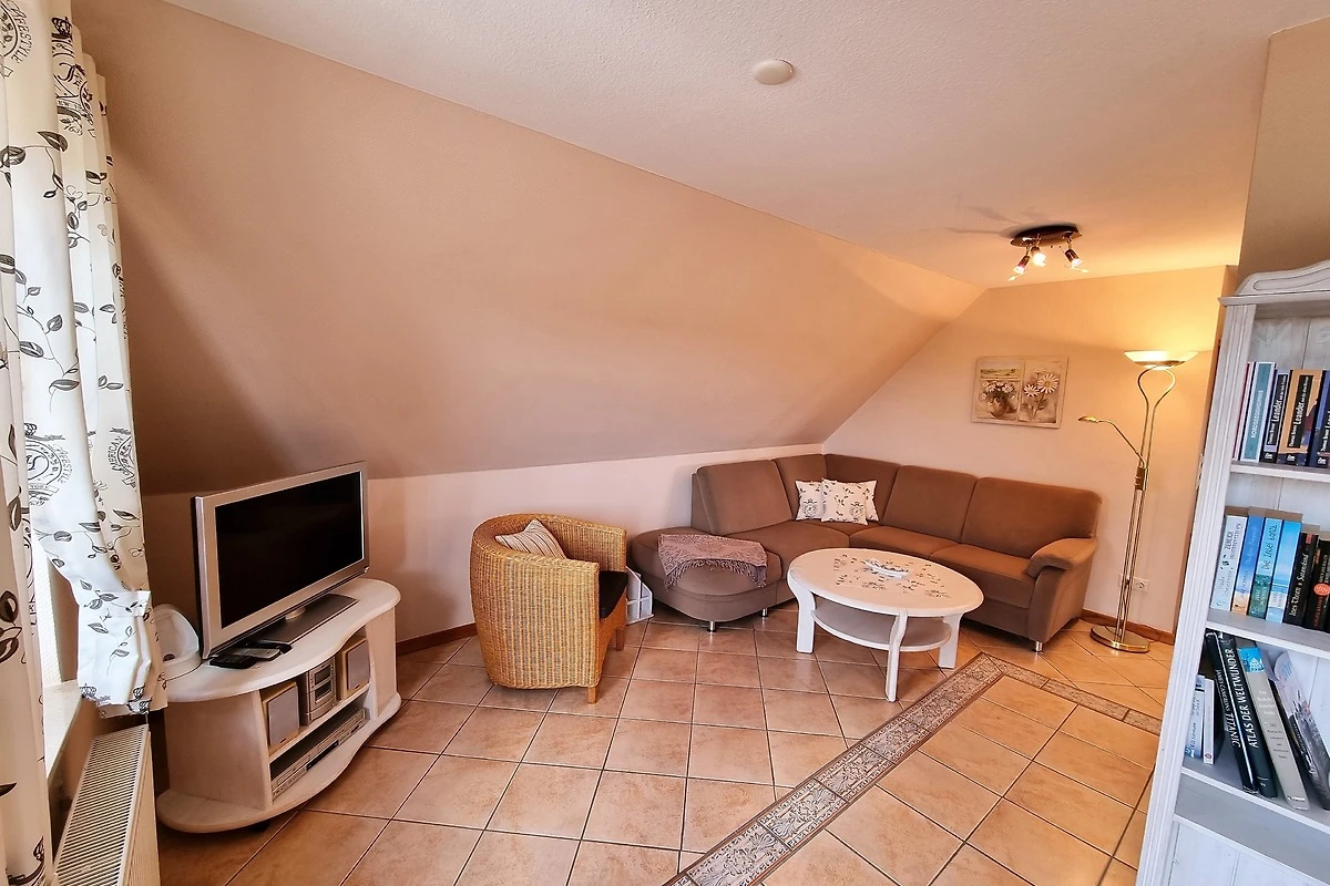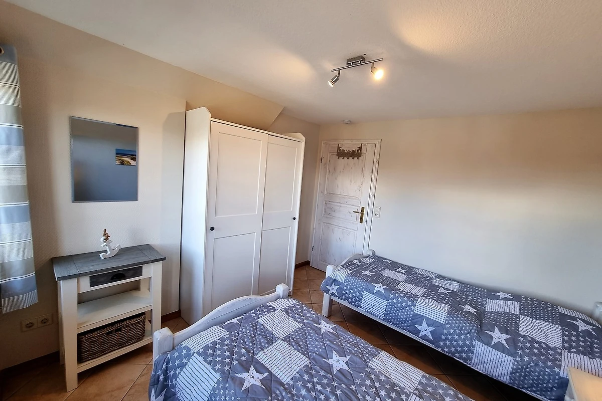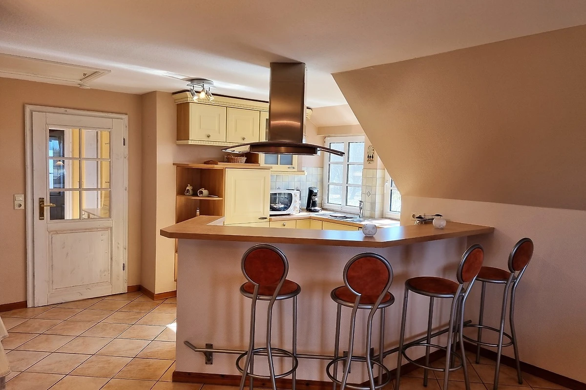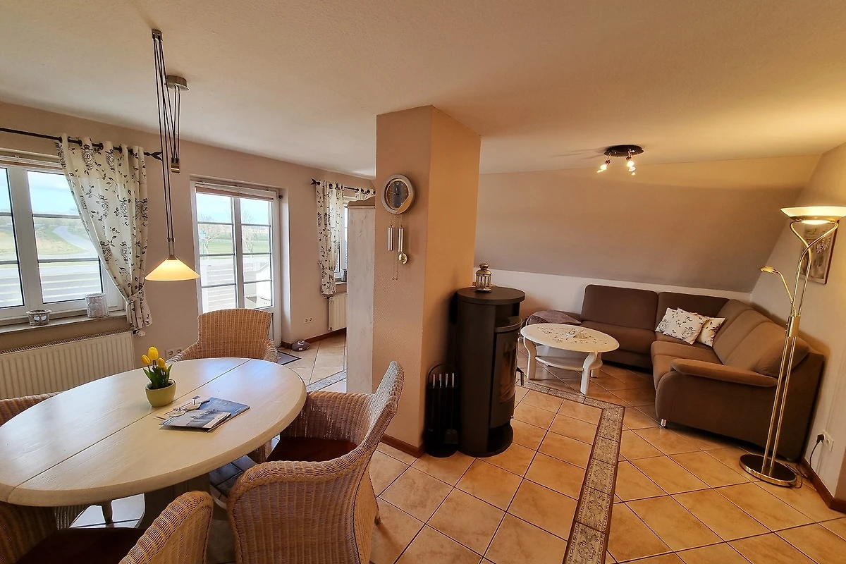 Diese gemütliche 75 qm grosse familienfreundliche Ferienwohnung im ersten Obergeschoss am Ortsrand von Oevenum freut sich auf ihren Besuch. Die offene Landhausküche mit Theke ist sehr gut ausgestattet und der grosszügige Wohn- Essbereich mit Kamin lädt zum Verweilen ein. Ein Schlafzimmer verfügt über ein Doppelbett 1,80x2,00 m und einem Kleiderschrank. Das zweite Schlafzimmer verfügt über zwei Einzelbetten 0,90x2,00 m und einem Kleiderschrank. Ein Kinderbett kann problemlos in den Schlafzimmern aufgebaut werden. Im geräumigen Bad haben sie die Wahl zwischen einer Badewanne oder der Dusche. Ein Föhn ist ebenfalls vorhanden. Auf dem Balkon im Strandkorb relaxen mit Blick auf die Wiesen und Felder ist hier ein Traum. Waschmaschine, Trockner, Kinderbett und Hochstuhl sind kostenlos nutzbar. Ein abschliessbarer Fahrradschuppen und ein Parkplatz sind direkt am Haus.