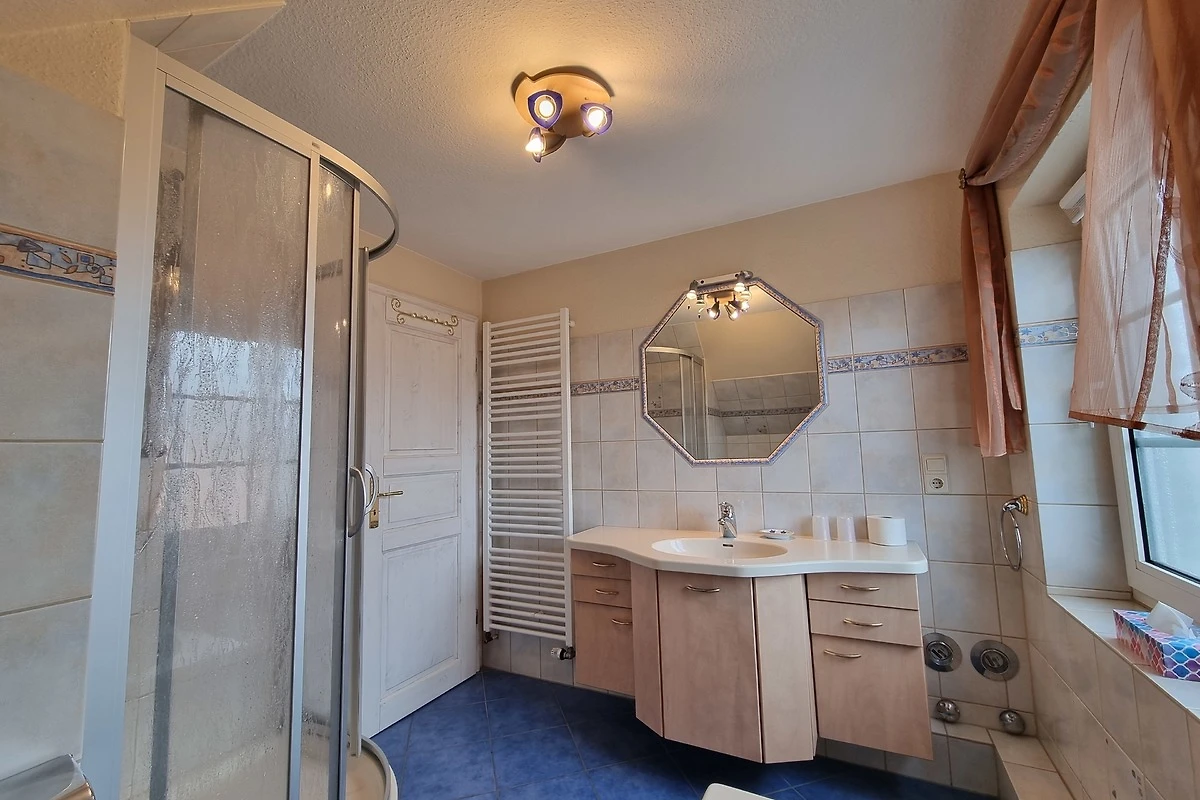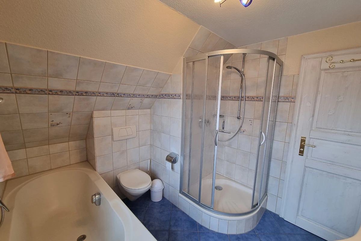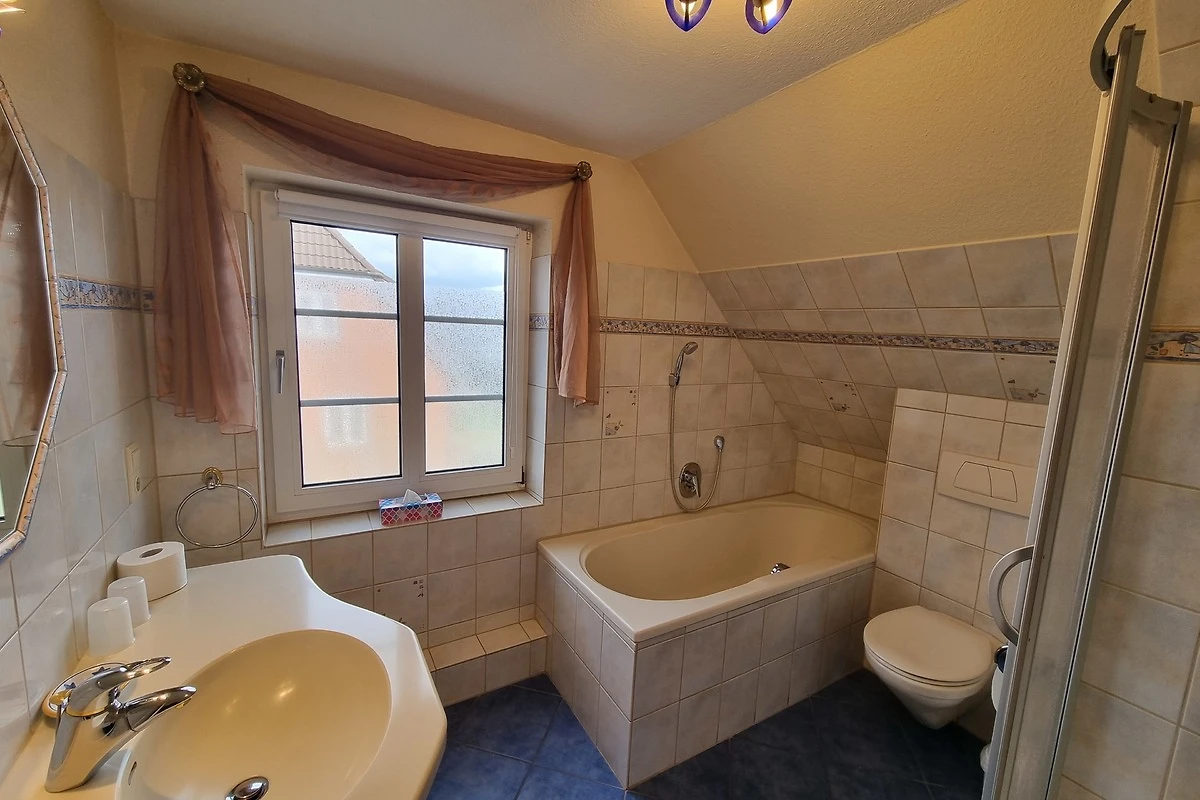 Im geräumigen Badezimmer haben Sie die Wahl zwischen Badewanne und Dusche. Ein Föhn ist ebenfalls vorhanden.